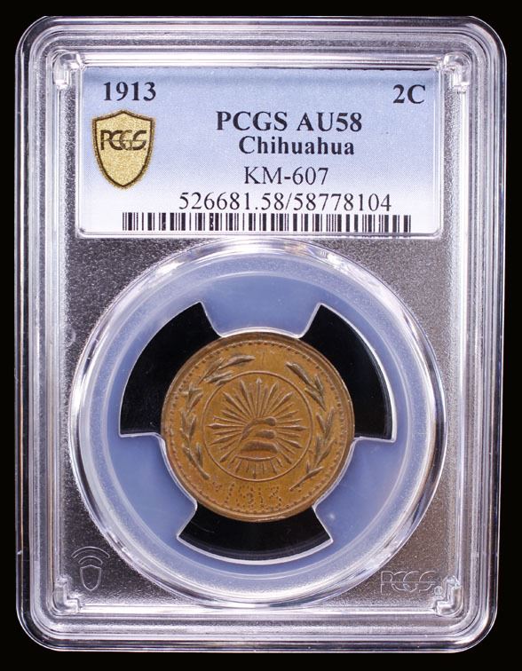 MEXICO: Revolutionary Issue, AE 2 centavos, Hidalgo del Parral, Chihuahua, 1913, KM-607, a lovely nearly mint state example, PCGS graded AU58, ex Richard A. Long. The trolley wire of the Parral-Santa Barbara Railway Company was used to make this issue per "The Coinage of the Mexican Revolutionists" by Howland Wood, 1928.