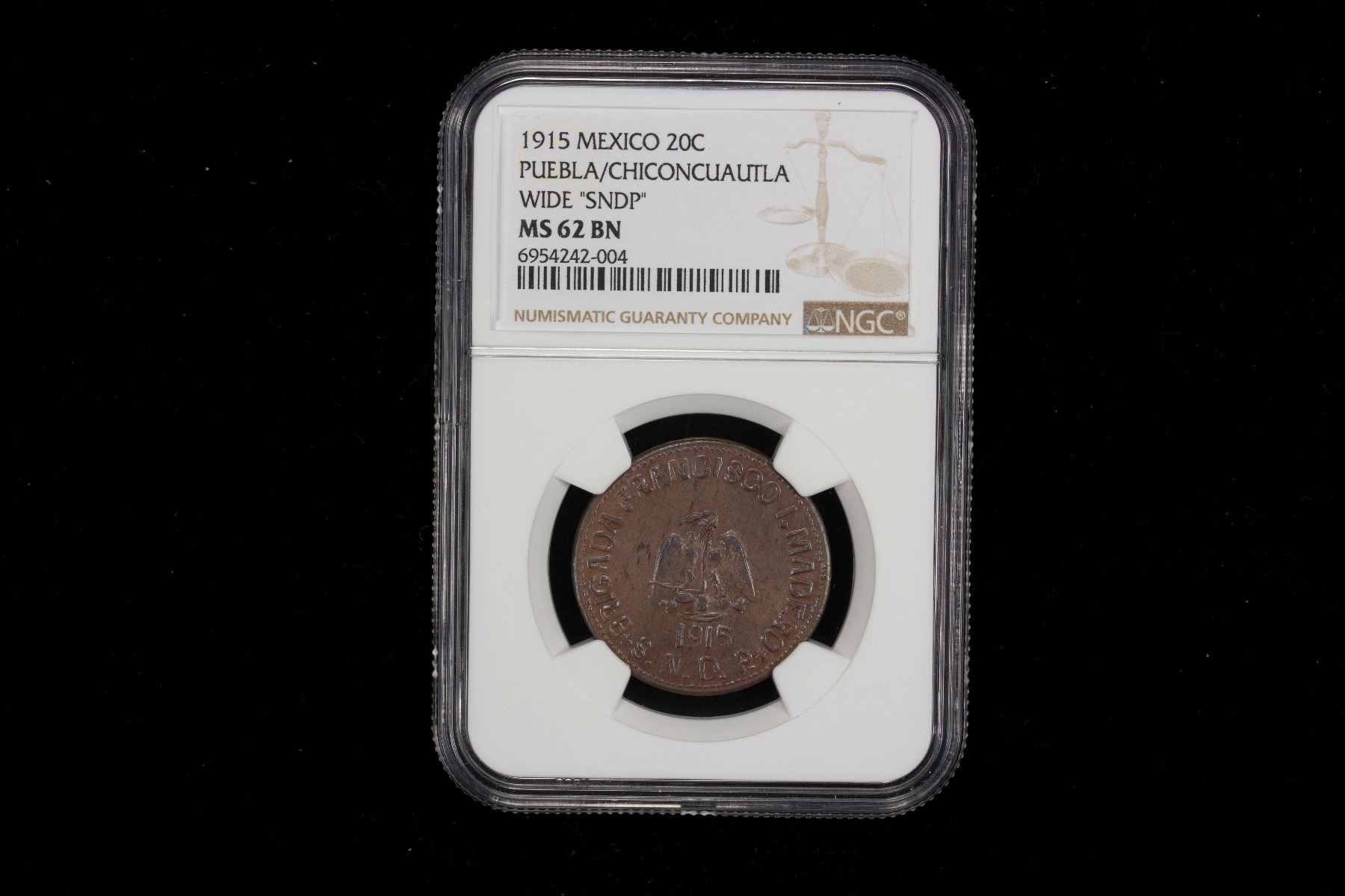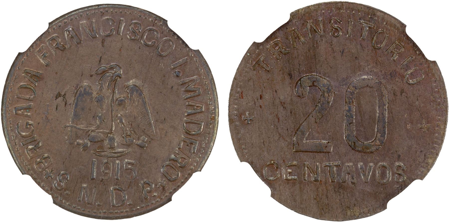 MEXICO: Revolutionary Issue, AE 20 centavos, Chiconcuatla, 1915, KM-758, Sierra Norte de Pueblo, Francisco Ignacio Madero Brigade, wide S.N.D.P. variety, a pleasing mint state example! NGC graded MS62 BN.