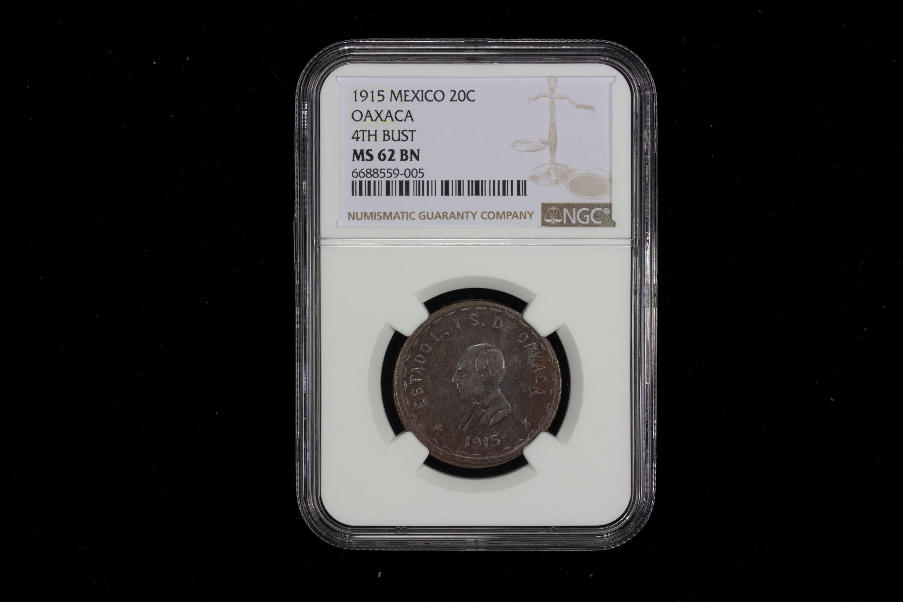 MEXICO: Revolutionary Issue, AE 20 centavos, Oaxaca, 1915, KM-729, Provisional Government issue, 4th bust, variety with long pointed truncation, a pleasing mint state example, NGC graded MS62 BN