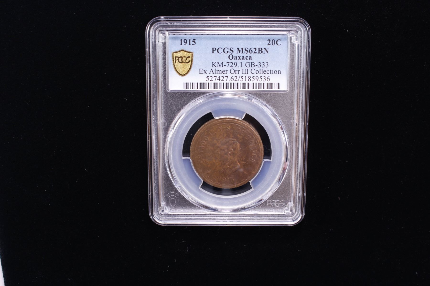 MEXICO: Revolutionary Issue, AE 20 centavos, Oaxaca, 1915, KM-729.1, GB-333, Provisional Government, bust of Benito Juárez, an attractive example, PCGS graded MS62 BN, ex Almer H. Orr III Collection.