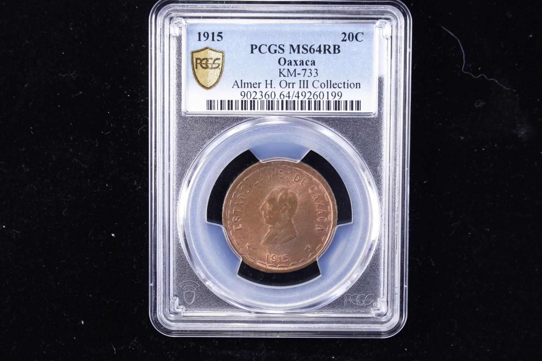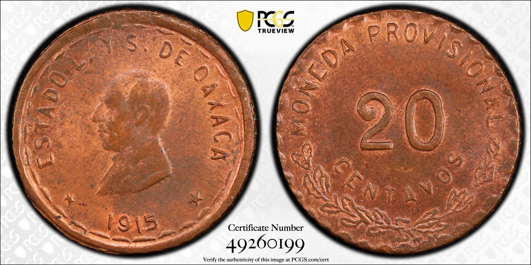 MEXICO: Revolutionary Issue, AE 20 centavos, Oaxaca, 1915, PCGS graded MS64 RB