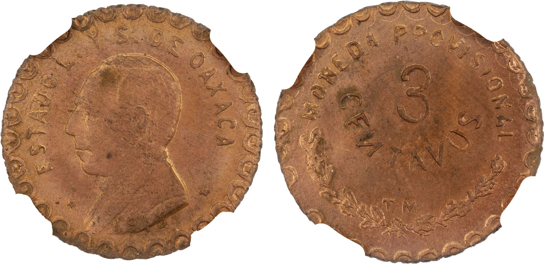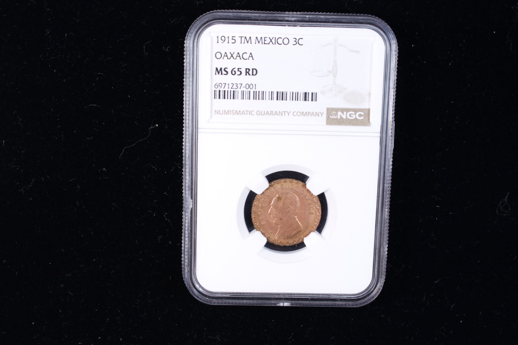 MEXICO: Revolutionary Issue, AE 3 centavos, Oaxaca, 1915, KM-714, Provisional Government issue, assayer TM, round top 3 variety, a superb red lustrous mint state example! NGC graded MS65 RD. The initials "TM" found on some 1915 Oaxaca coins stand for Teofilo Monroy, who was appointed as the Director of the Oaxaca Mint during that time. He, along with John De Coe, the Chief Engraver, played a significant role in the operation of the mint during the Mexican Revolution.