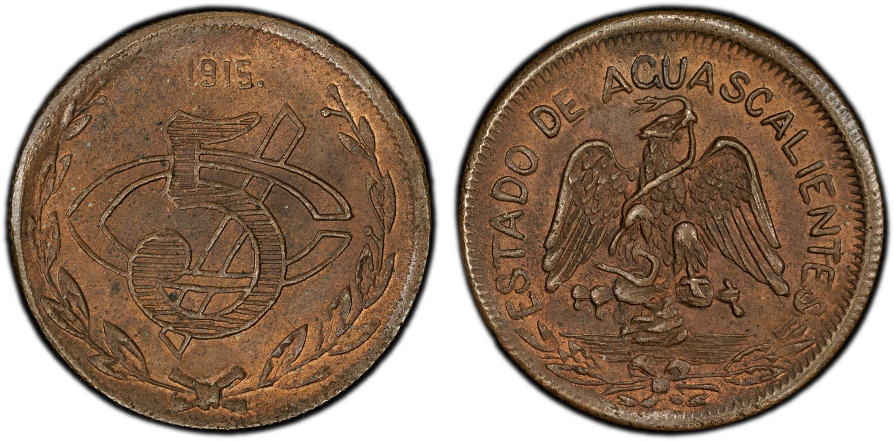 MEXICO: Revolutionary Issue, AE 5 Centavos, Aguascalientes, 1915, PCGS MS63 BN