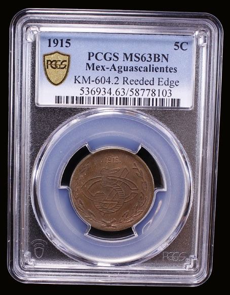 MEXICO: Revolutionary Issue, AE 5 Centavos, Aguascalientes, 1915, KM-604.2, GB-17, horizontally shaded 5, reeded edge variety, a bold lustrous example, PCGS graded MS63 BN, ex Richard A. Long. The single finest example on the PCGS population report (Top Pop).