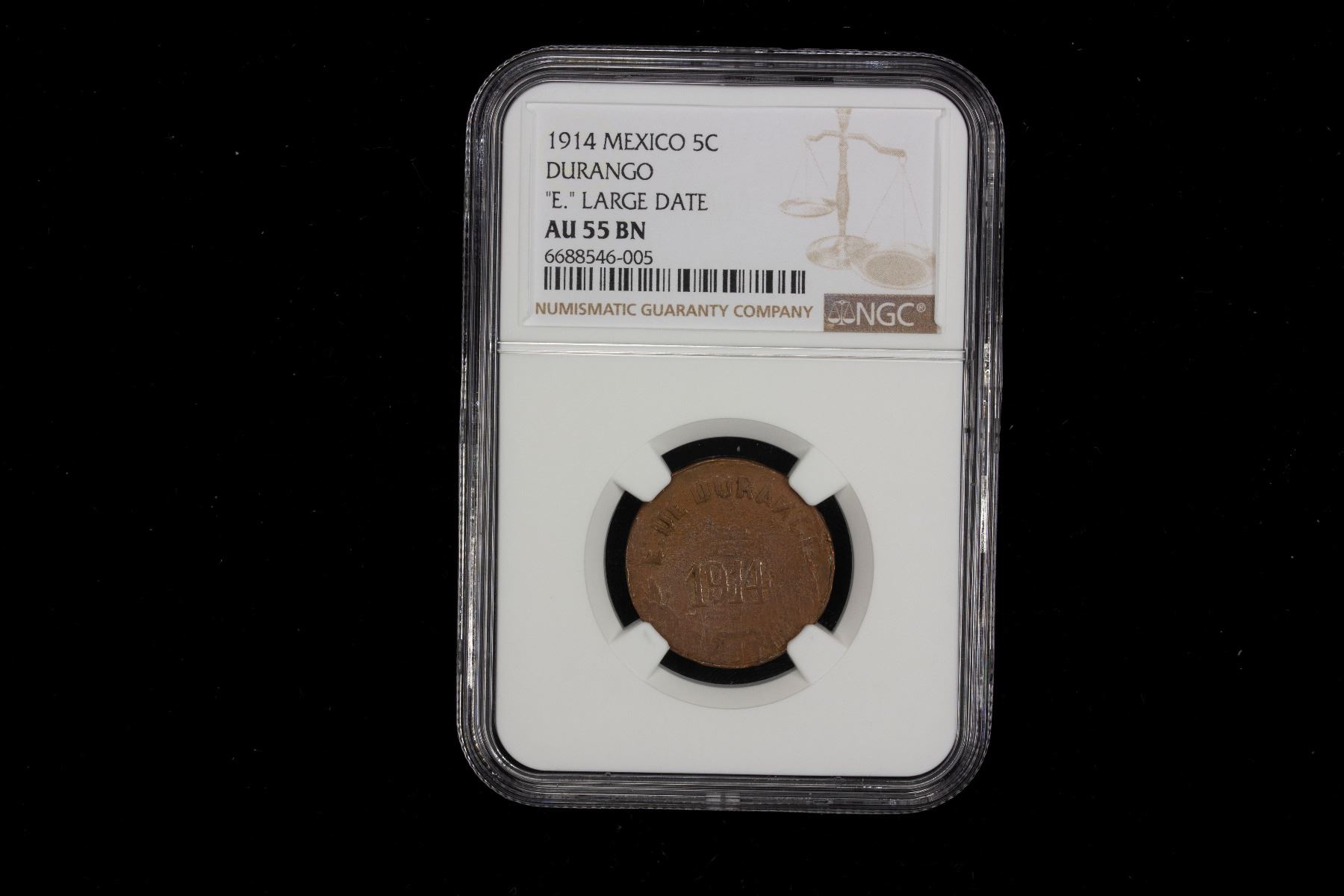 MEXICO: Revolutionary Issue, AE 5 centavos, Durango, 1915, KM-631, "E." in obverse legend, variety with square "C" in CENTAVO, NGC graded AU55 BN.