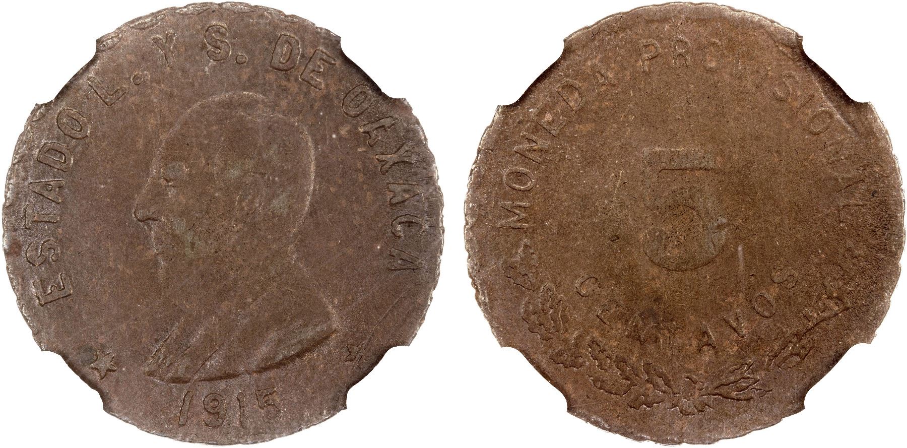 MEXICO: Revolutionary Issue, AE 5 centavos, Oaxaca, 1915, KM-732, Provisional Government issue, 6th bust, curved bottom variety, a pleasing mint state example, NGC graded MS62 BN.