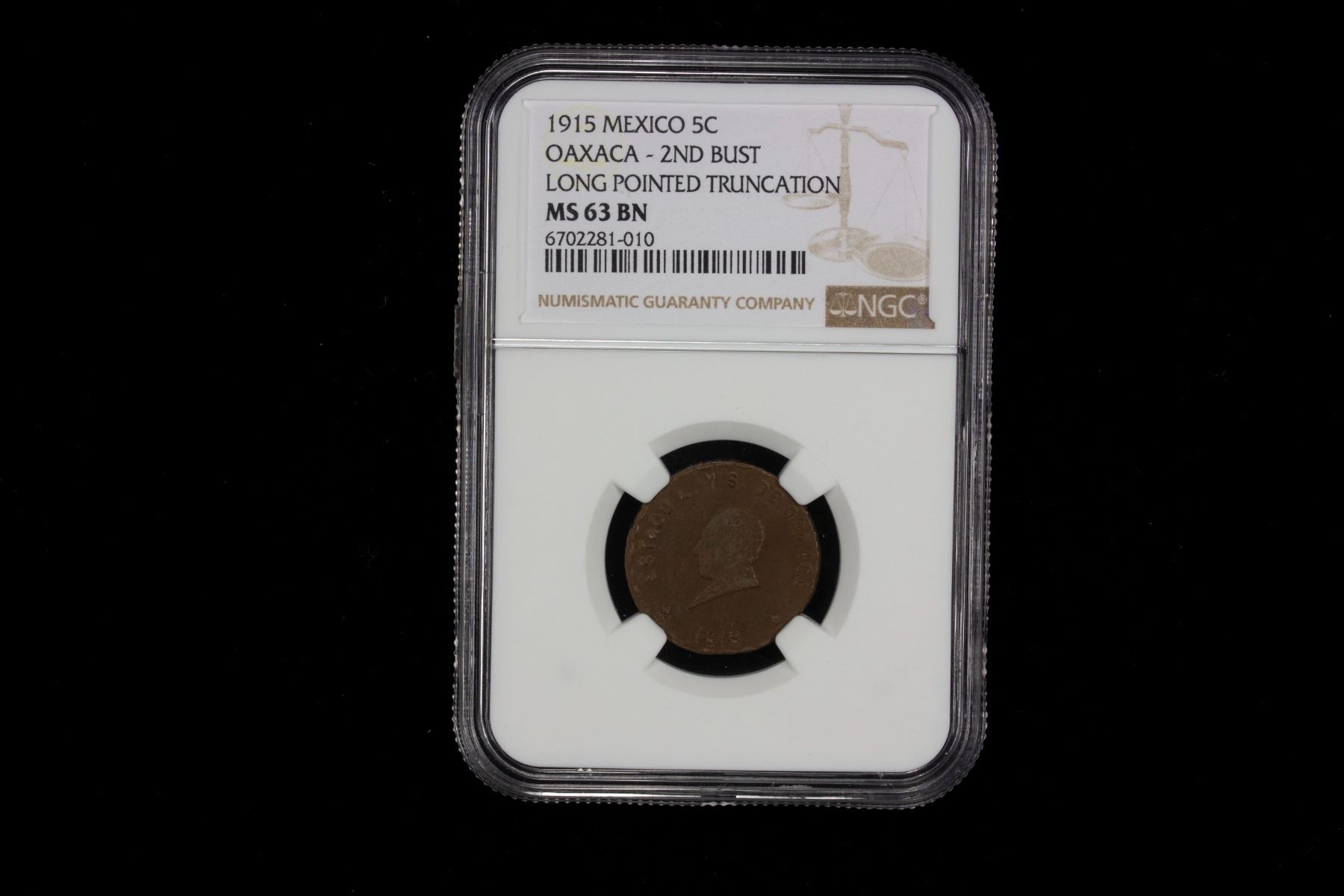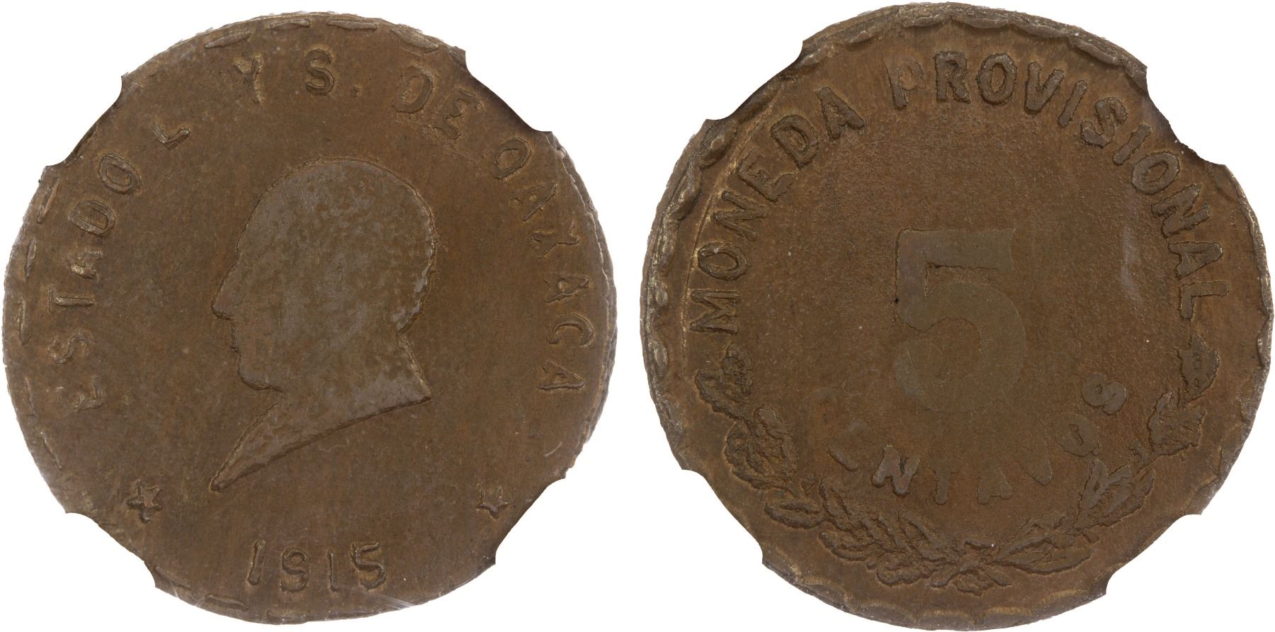 MEXICO: Revolutionary Issue, AE 5 centavos, Oaxaca, 1915, KM-717, Provisional Government issue, 2nd bust, variety with long pointed truncation, a lovely mint state example! NGC graded MS63 BN.