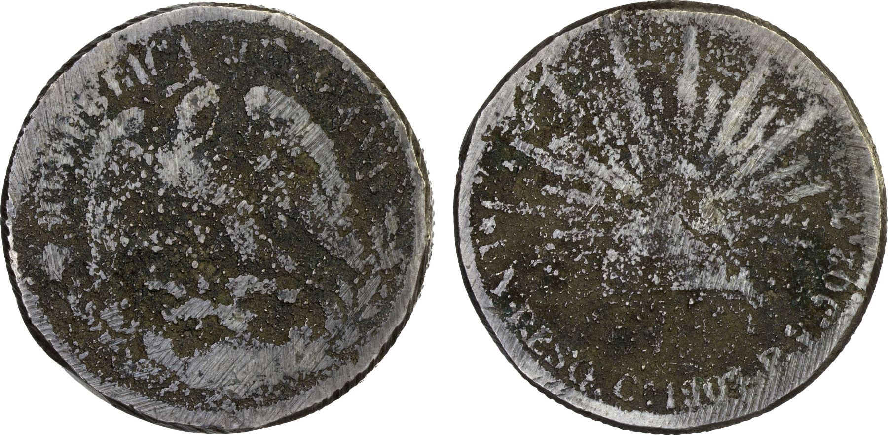 MEXICO: Revolutionary Issue, AE centavo (28.83g), Sinaloa, 1914-Mo, KM-769, sand-cast silver necessity issue using a 1905-Cn Cap & Ray peso (assayer RP) for a mold, with usual adjustment scratches, a fantastic example with legible mint and date, NGC graded Genuine, Fine, ex Richard Long Auction 53 (June 1988), ex The 1914 Collection. Accompanied by NGC tag, without encapsulation as normal.