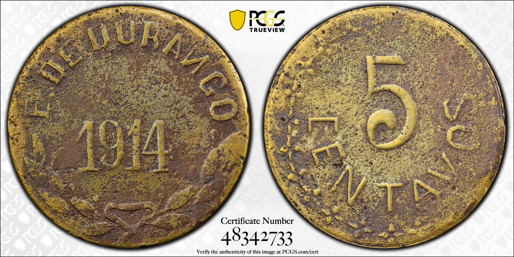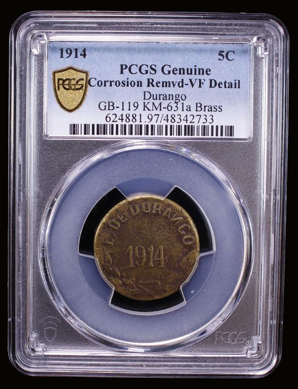 MEXICO: Revolutionary Issue, brass 5 centavos, Durango, 1914, PCGS VF details