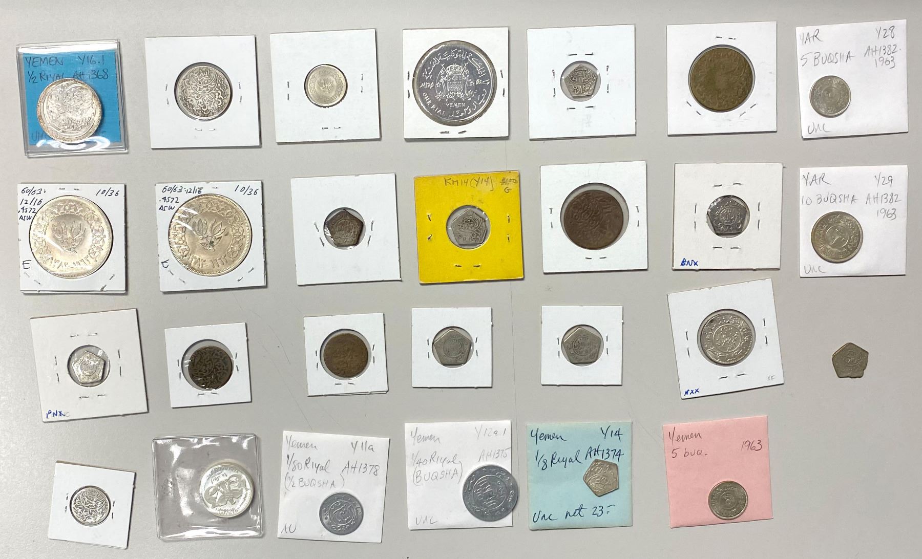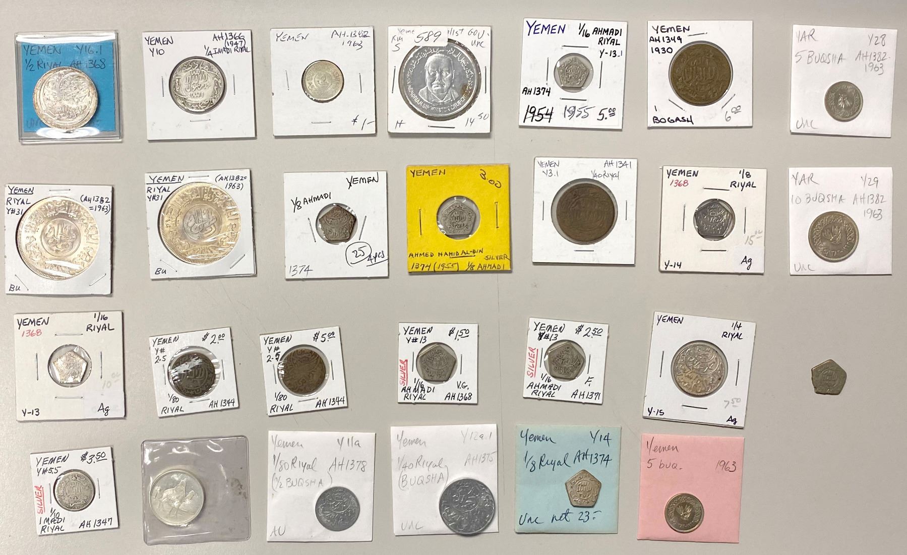 MIDDLE EAST: Yemen, LOT of 27 coins, including 1/10 imadi riyal (1 pc), ¼ imadi riyal (1), 1/80 riyal (3), 1/40 riyal (3), 1/16 ahmadi riyal (2), 1/8 ahmadi riya (7), ¼ ahmadi riyal (1), ½ ahmadi riyal (1), 5 buqsha (3), 10 buqsha (1) riyal (2, 1963), rial (1, AH1385 Churchill), and riyal (1, 1969 Camel); average circulated grades, including many uncs, most in silver, in consignor's holders, viewing recommended; retail value $600, lot of 27 pieces.