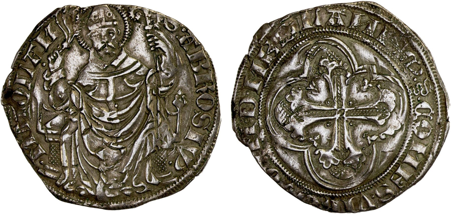 MILAN: Gian Galeazzo Visconti, 1385-1402, AR grosso (2.15g), Crippa-7, MIR-119, cross fleury in quadrilobe // St. Ambrose mitred, nimbate, and without beard seated facing, holding scourge and crozier, VF-XF.