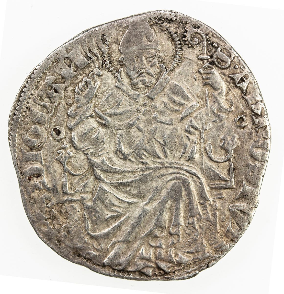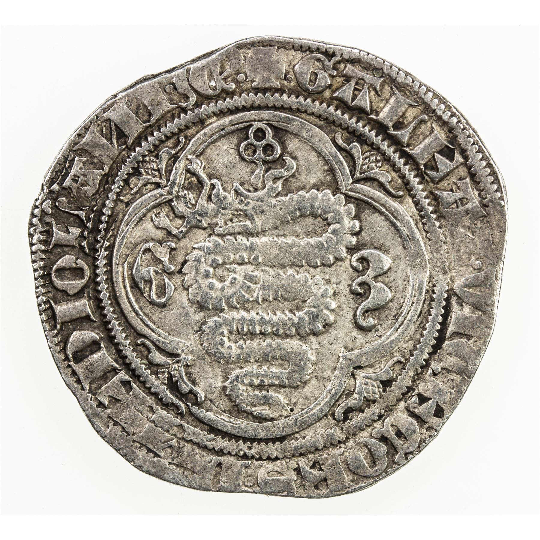 MILAN: Gian Galeazzo Visconti, 1395-1402, AR grosso (1.52g), Biaggi-1475, Crippa-4/a, coiled serpent devouring man, G-3 across field, small trefoil above, all within quadrilobe decorated with flowers, + GALEAZ VICE COES D MEDIOLANVM // St. Ambrosius enthroned facing, holding flagellum and crozier, S ABROSIV' MEDIOLAN, VF.