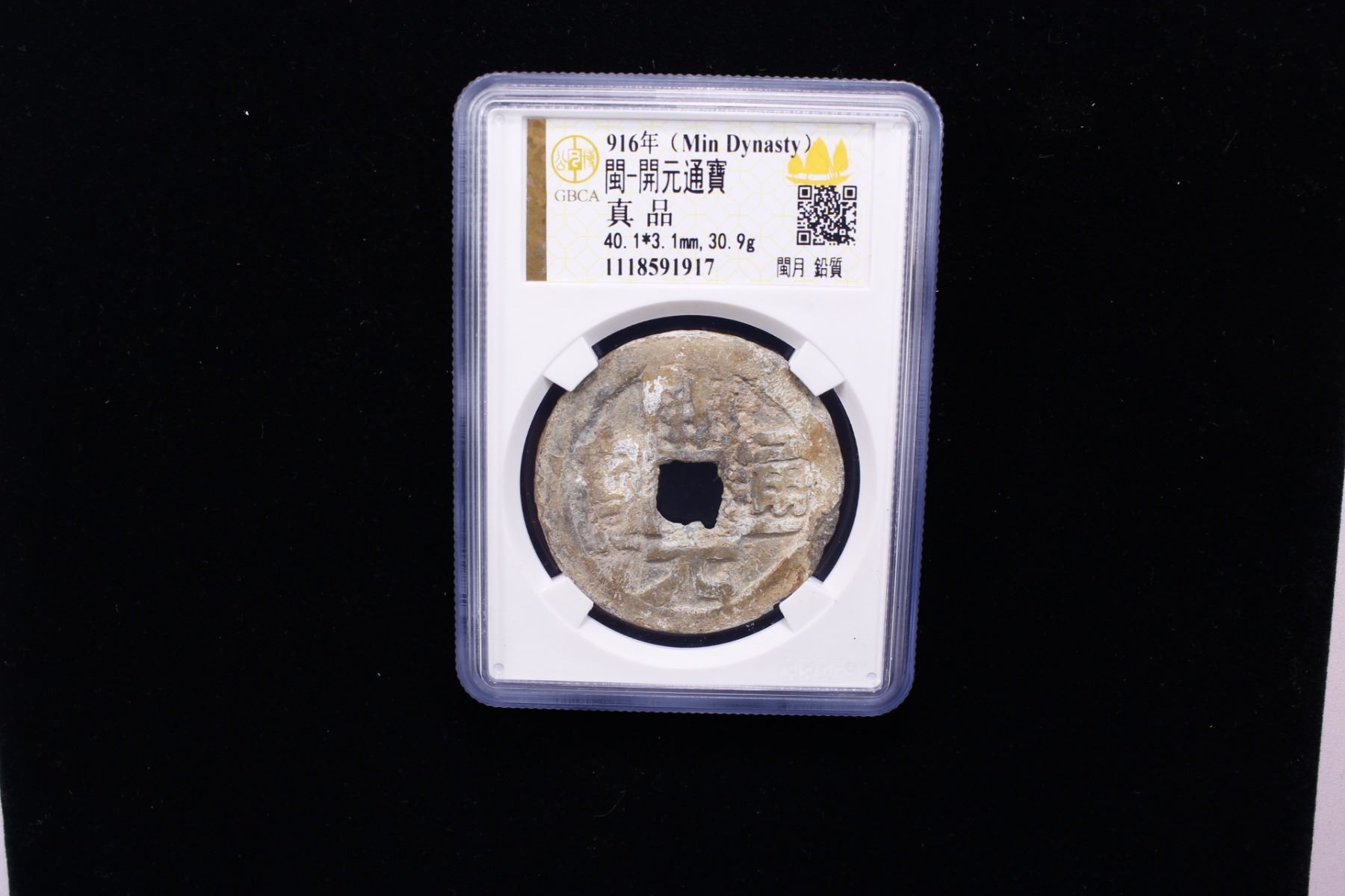 MIN: Wang Shenzhi, 909-945, lead large cash (30.9g), H-15.51, kai yuan tong bao on obverse, min above, crescent below, for use in the Fujian area, usual oxidation, graded 'Genuine' by GBCA Grading Company, Fine. Min was one of the 'Ten Kingdoms' and it existed in a mountainous region of modern-day Fujian province of China and had a history of quasi-independent rule with its capital at Fuzhou. It was founded by Wang Shenzhi. His father was given the title of Surveillance Commissioner in 892. Wang Shenzhi himself was named military commissioner. In 909, in the wake of the collapse of the Tang Dynasty two years earlier, he named himself the Prince of Min. Wang Shenzhi's son declared himself the Emperor of Min in 933. At that point, his father was posthumously named Min Taizu. The capital of the Min Kingdom was then known as Changle, the present day Fuzhou. The kingdom was essentially limited to modern-day Fujian Province in China's southeast. The Kingdom of Min was conquered by the Southern Tang Kingdom in 945 AD.