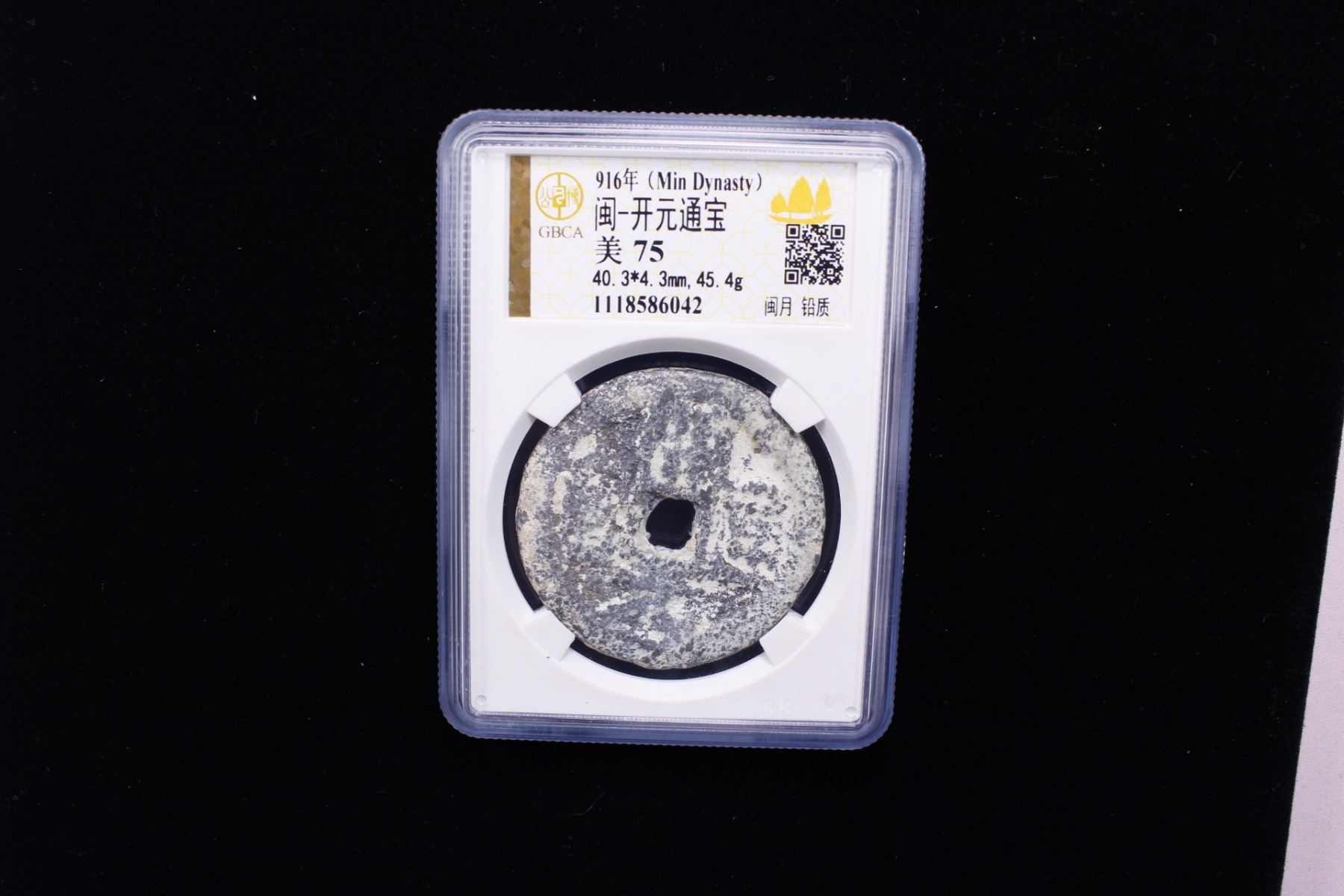 MIN: Wang Shenzhi, 909-945, lead large cash (45.4g), H-15.51, kai yuan tong bao on obverse, min above, crescent below, for use in the Fujian area, usual oxidation, graded 75 by GBCA Grading Company, Fine. Min was one of the 'Ten Kingdoms' and it existed in a mountainous region of modern-day Fujian province of China and had a history of quasi-independent rule with its capital at Fuzhou. It was founded by Wang Shenzhi. His father was given the title of Surveillance Commissioner in 892. Wang Shenzhi himself was named military commissioner. In 909, in the wake of the collapse of the Tang Dynasty two years earlier, he named himself the Prince of Min. Wang Shenzhi's son declared himself the Emperor of Min in 933. At that point, his father was posthumously named Min Taizu. The capital of the Min Kingdom was then known as Changle, the present day Fuzhou. The kingdom was essentially limited to modern-day Fujian Province in China's southeast. The Kingdom of Min was conquered by the Southern Tang Kingdom in 945 AD.