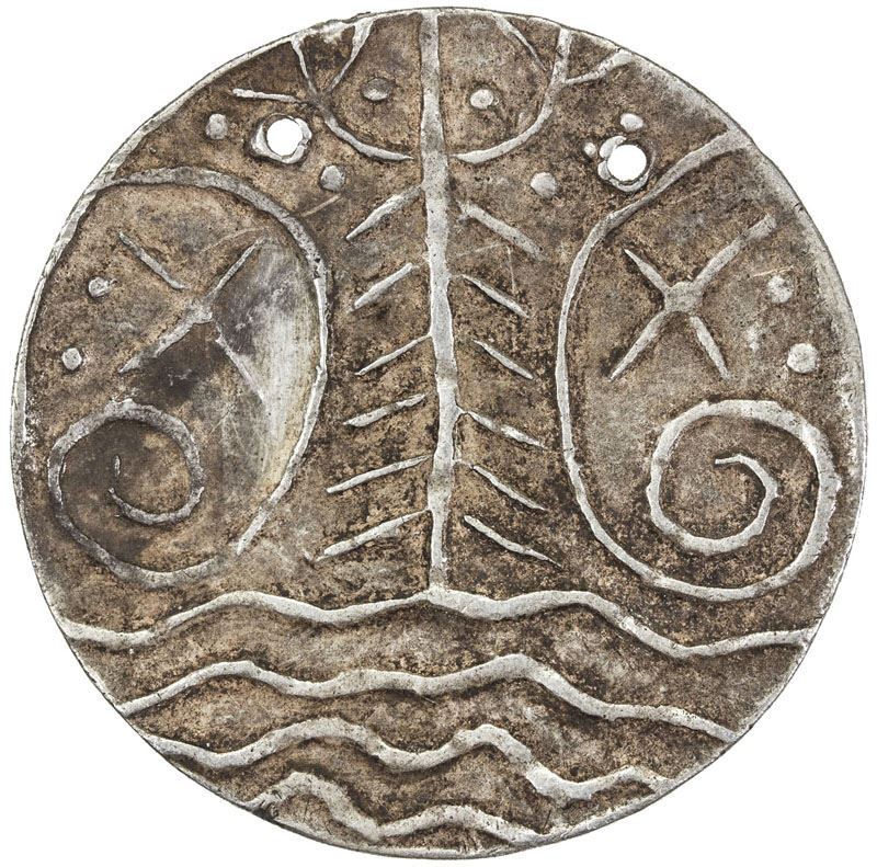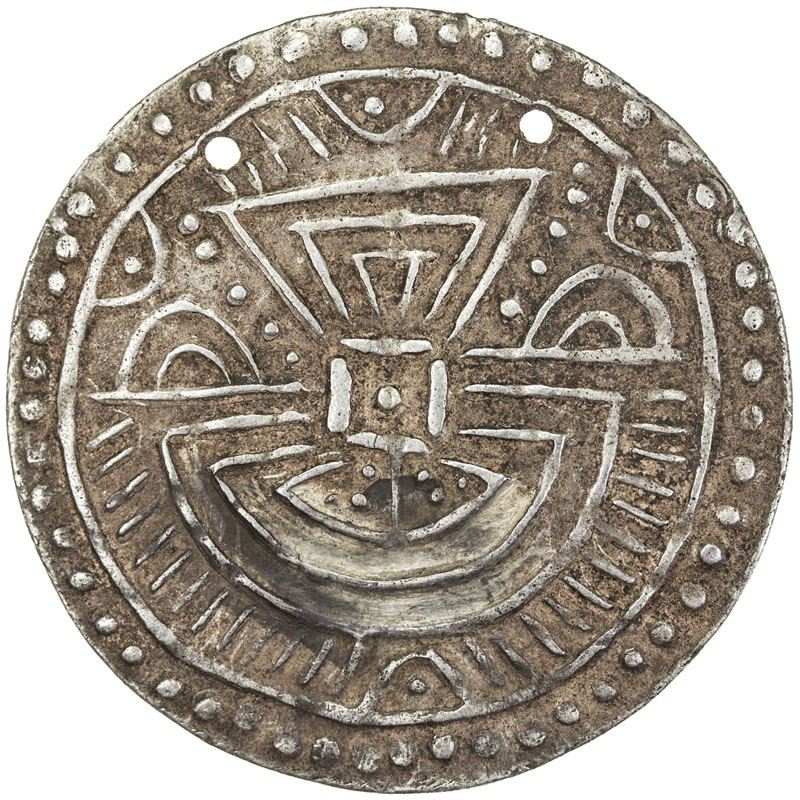 MINEMAW: AR amulet (10.19g), ca. 10th century or later, Htun, pp. 115 ff, Mahlo, p.165, ornate image of the bhadrapitha // remote design based on the srivatsa, "X" left & right, twice perforated as usual, VF to EF, ex Hans Mondorf Collection.
