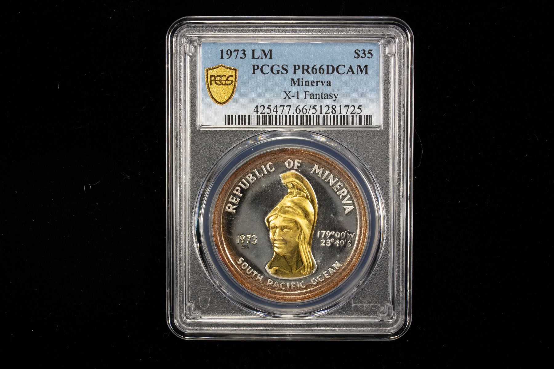 MINERVA: Republic, AR 35 dollars, 1973-LM, KM-X1, selectively gilt, struck at the Letcher Mint in Lancaster, California, PCGS graded Proof 66 DCAM. The Republic of Minerva was a micronation consisting of the Minerva Reefs. It was one of the few modern attempts at creating a sovereign micronation on the reclaimed land of an artificial island in 1972. The Minerva Reefs are a group of two submerged atolls located in the Pacific Ocean between Fiji and Tonga. The islands are the subject of a territorial dispute between Fiji and Tonga, and in addition were briefly claimed by American Libertarians as the Republic of Minerva.