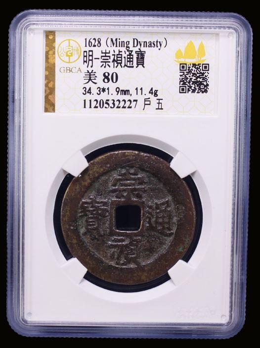 MING: Chong Zhen, 1628-1644, AE 5 cash (11.4g), Board of Revenue Mint, H-20.329, hu at right and wu (five) at left on reverse, graded 80 by GBCA Grading Company, VF.