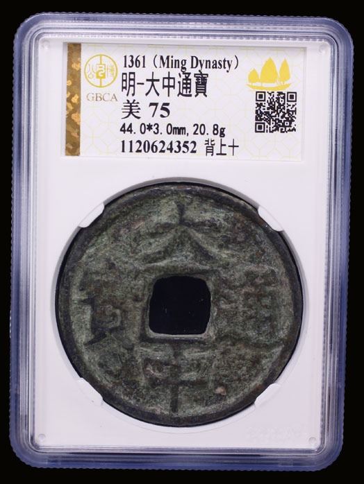 MING: Da Zhong, 1361-1368, AE 10 cash (20.8g), H-20.45, shi (ten) above on reverse, graded 75 by GBCA Grading Company, VF. Zhu Yuanzhang, later Hongwu, was already in control of Nanjing from 1356 and was conferred the title of "Duke of Wu" by the rebel leader Han Lin'er in 1361. He started autonomous rule as the self-proclaimed "Prince of Wu" on February 4, 1364. He was proclaimed emperor on January 23, 1368 and established the Ming dynasty on that same day.