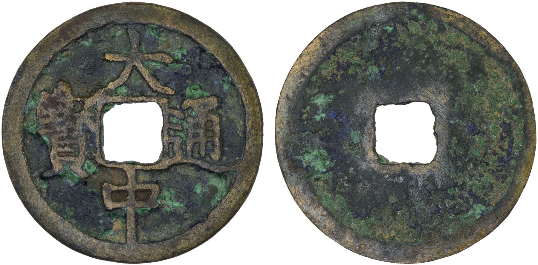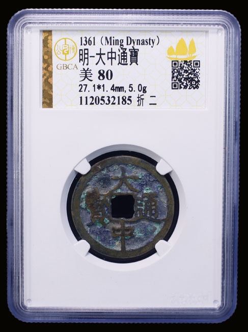 MING: Da Zhong, 1361-1368, AE 2 cash (5g), H-20.13, graded 80 by GBCA Grading Company, VF. The first cash coins issued by Zhu Yuanzhang actually bore the inscription "Dazhong Tongbao" because he wanted to name his country the "Great Zhong" dynasty, but eventually the name settled on was the "Great Ming" dynasty. The Hongwu period was proclaimed in 1368 and the introduction of the Hongwu Tongbao coins began then. Despite the new coinage being issued the "Dazhong Tongbao" coins would continue to be cast as reconquering China from the Mongols took several more years.