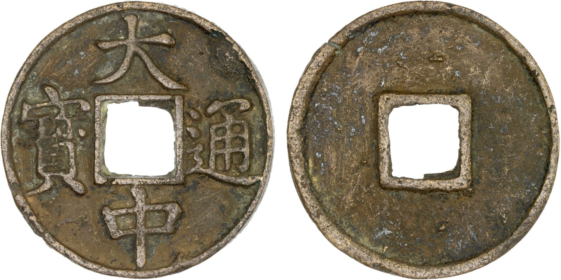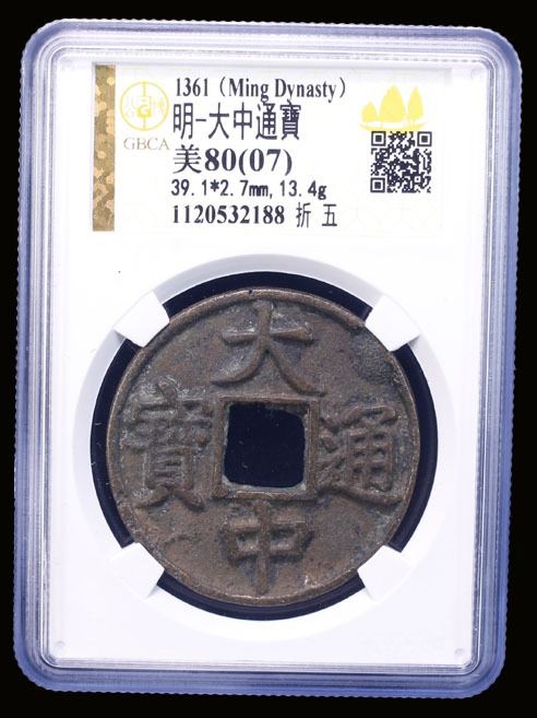 MING: Da Zhong, 1361-1368, AE 5 cash (13.4g), H-20.33, graded 80(07) by GBCA Grading Company, natural casting defects, VF. The first cash coins issued by Zhu Yuanzhang actually bore the inscription "Dazhong Tongbao" because he wanted to name his country the "Great Zhong" dynasty, but eventually the name settled on was the "Great Ming" dynasty. The Hongwu period was proclaimed in 1368 and the introduction of the Hongwu Tongbao coins began then. Despite the new coinage being issued the "Dazhong Tongbao" coins would continue to be cast as reconquering China from the Mongols took several more years.