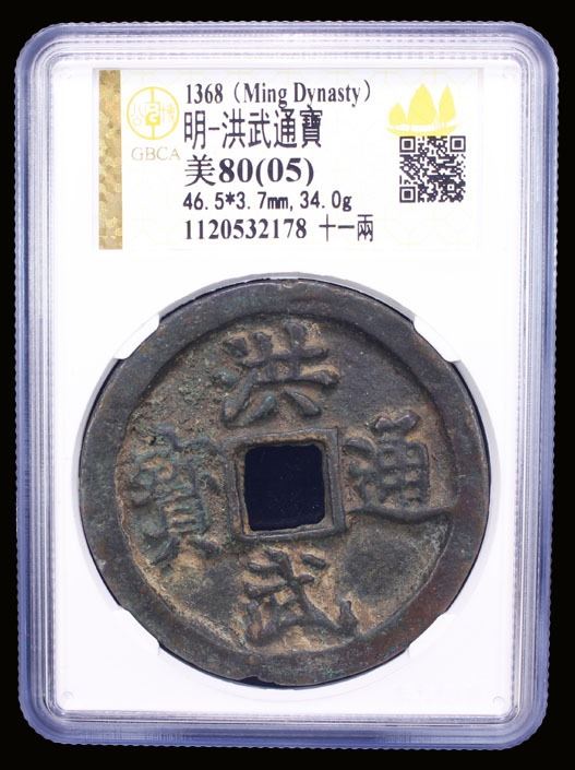 MING: Hong Wu, 1368-1398, AE 10 cash (34g), H-20.111, shi (ten) above, yi liang at right on reverse, graded 80(05) by GBCA Grading Company, natural flan crack, VF.