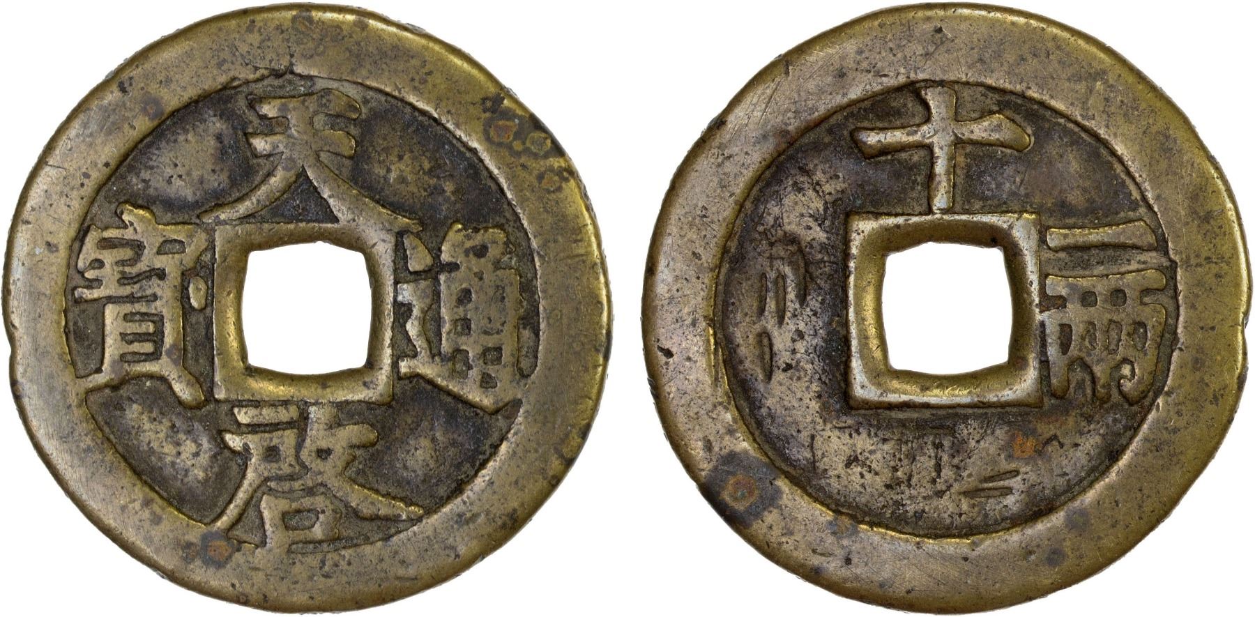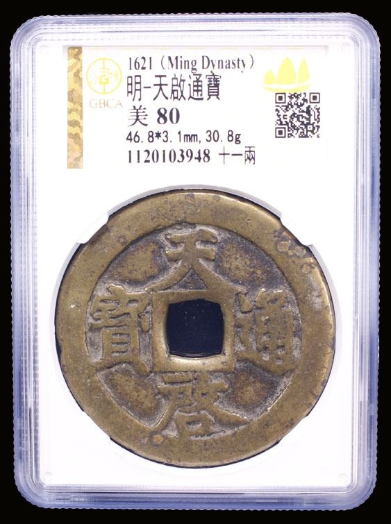 MING: Tian Qi, 1621-1627, AE 10 cash (30.8g), H-20.229, 48mm, shi (ten) above, yi liang at right on reverse, graded 82 by GBCA Grading Company, VF.