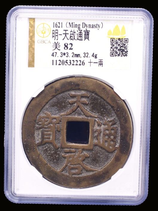 MING: Tian Qi, 1621-1627, AE 10 cash (32.4g), H-20.229, 47mm, shi (ten) above, yi liang at right on reverse, graded 82 by GBCA Grading Company, VF.
