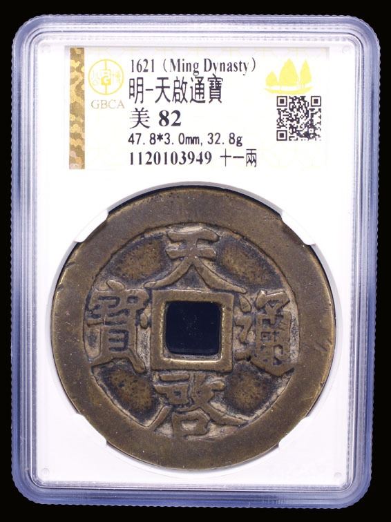 MING: Tian Qi, 1621-1627, AE 10 cash (32.8g), H-20.229, 47mm, shi (ten) above, yi liang at right on reverse, graded 80 by GBCA Grading Company, VF.