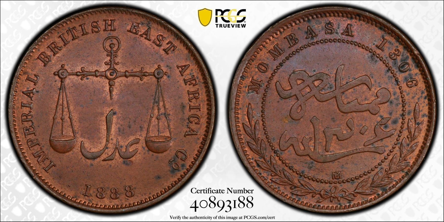 MOMBASA: Victoria, 1888-1896, AE pice, 1888/AH1306, PCGS MS63 BN