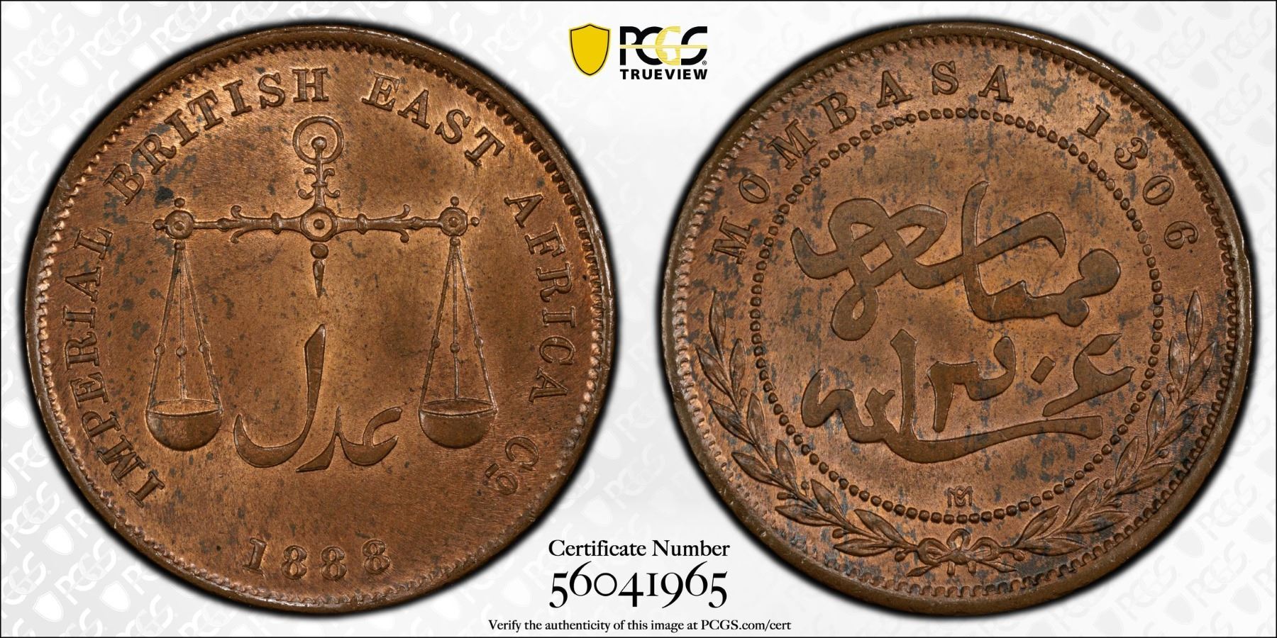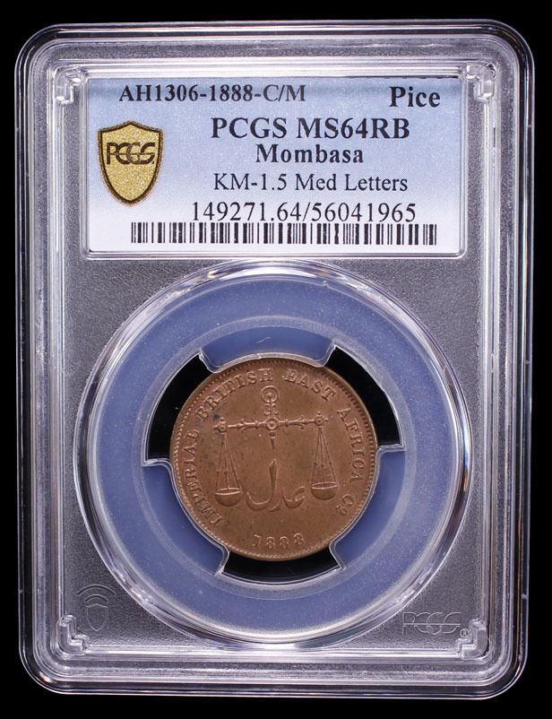 MOMBASA: Victoria, 1888-1896, AE pice, 1888-CM, KM-1.5, Imperial British East Africa Company issue, Calcutta Mint, medium letters variety, a wonderful example, PCGS graded MS64 RB.