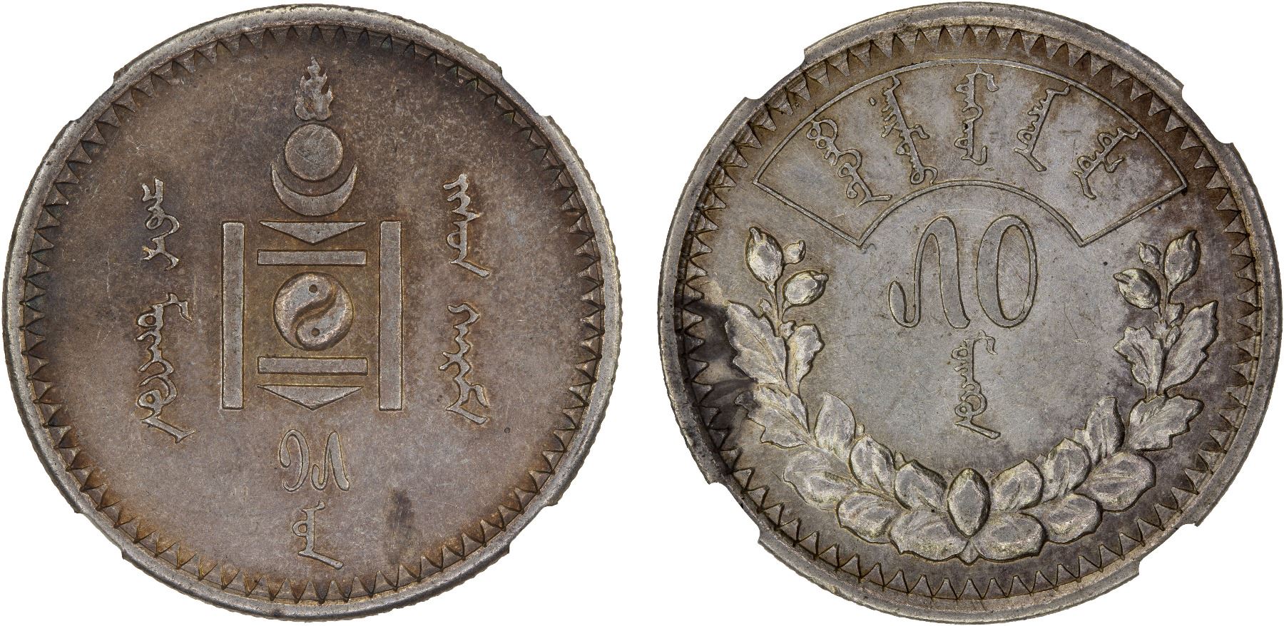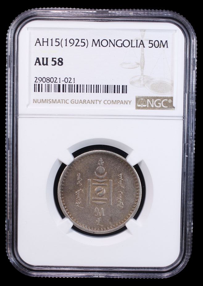 MONGOLIA: People's Republic, AR 50 mongo, year 15 (1925), KM-7, one-year type, lightly toned, PCGS graded AU58.