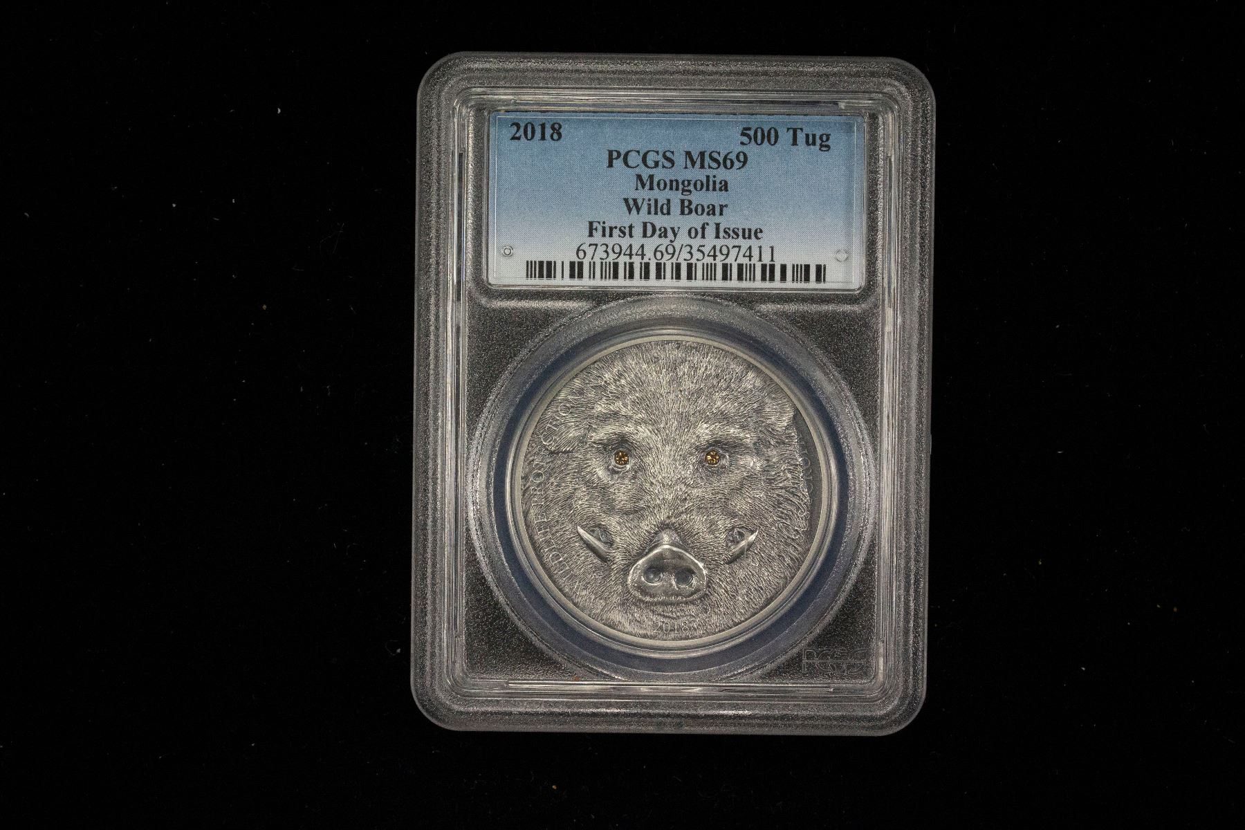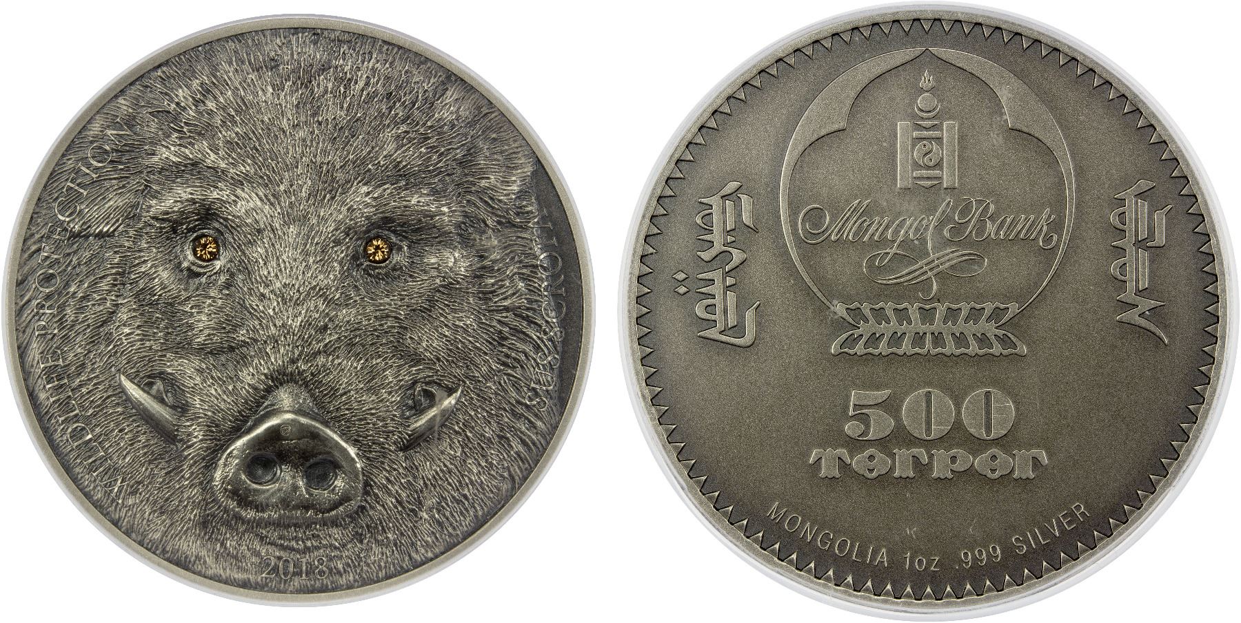 MONGOLIA: People's Republic, AR 500 tugrik, 2018, KM-378, N-144110, Wild Boar, antique finish, amber-colored Swarovski crystal eyes, label inscribed "First Day of Issue", PCGS graded MS69.