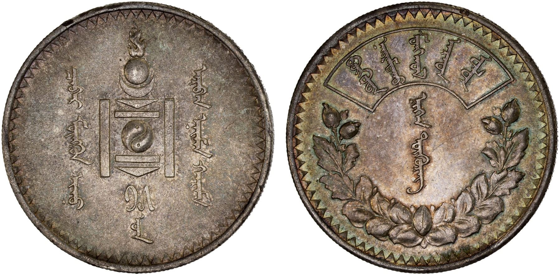 MONGOLIA: People's Republic, AR tugrik, year 15 (1925), KM-8, struck at the Leningrad Mint, a pleasing toned lustrous example, Almost Unc to Unc.