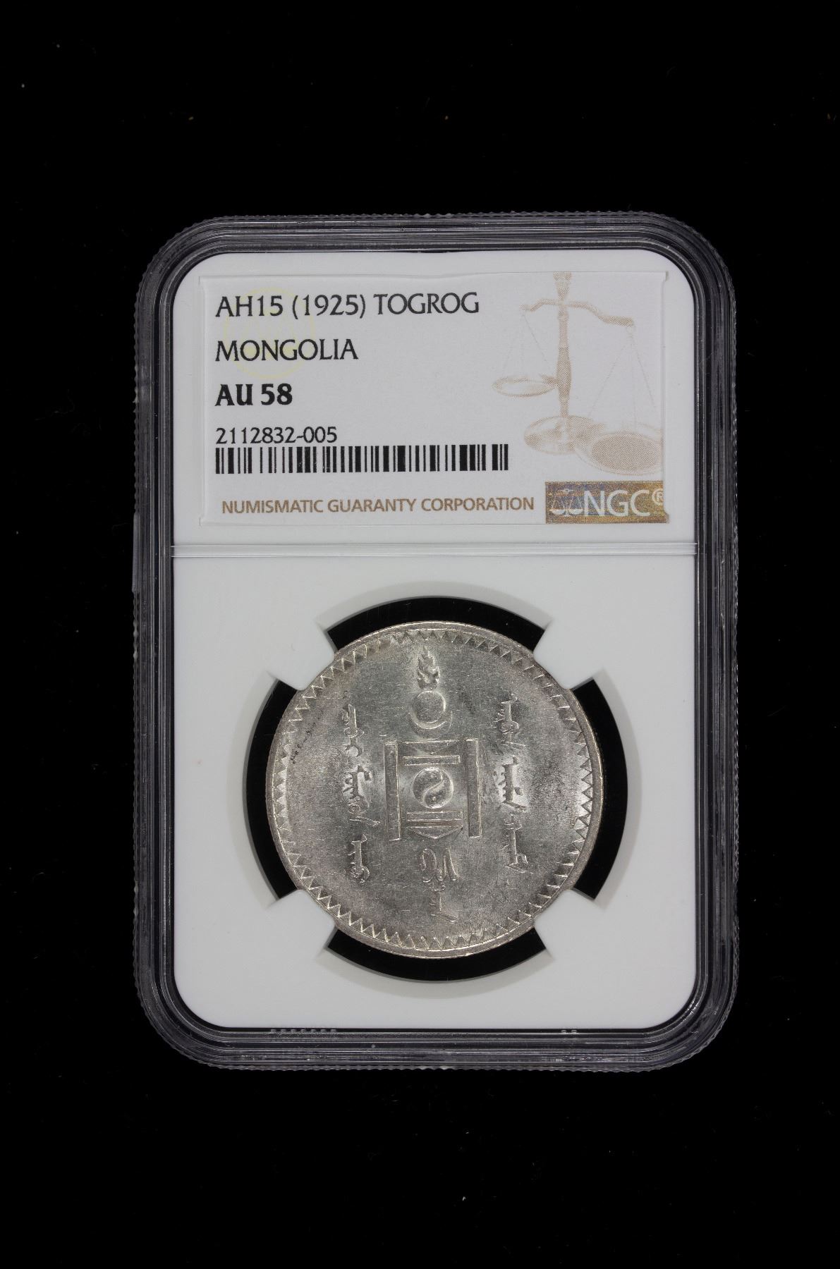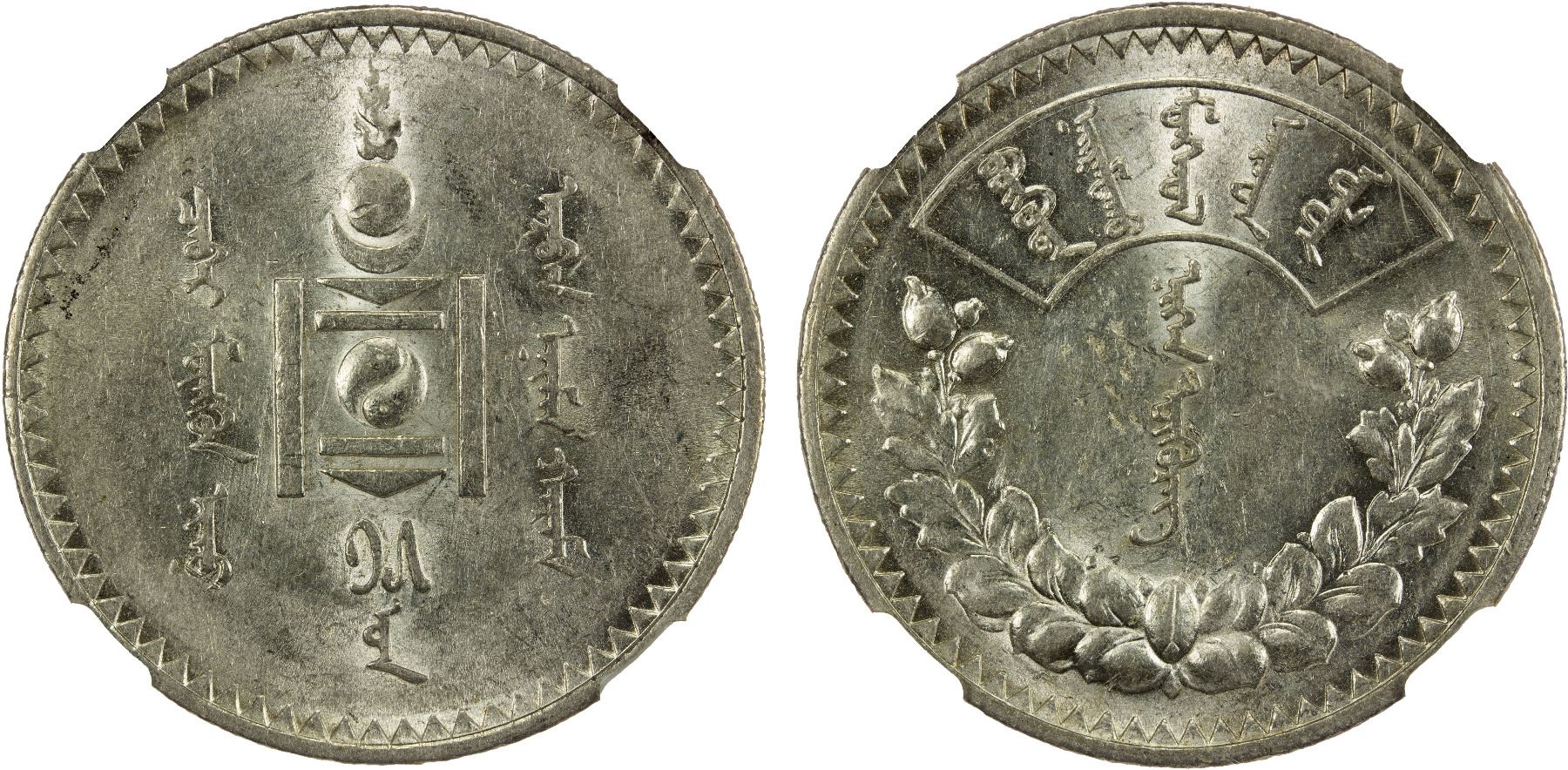 MONGOLIA: People's Republic, AR tugrik, year 15 (1925), KM-8, L&M-619, struck at the Leningrad Mint, a very lustrous near-mint example, NGC graded AU58.
