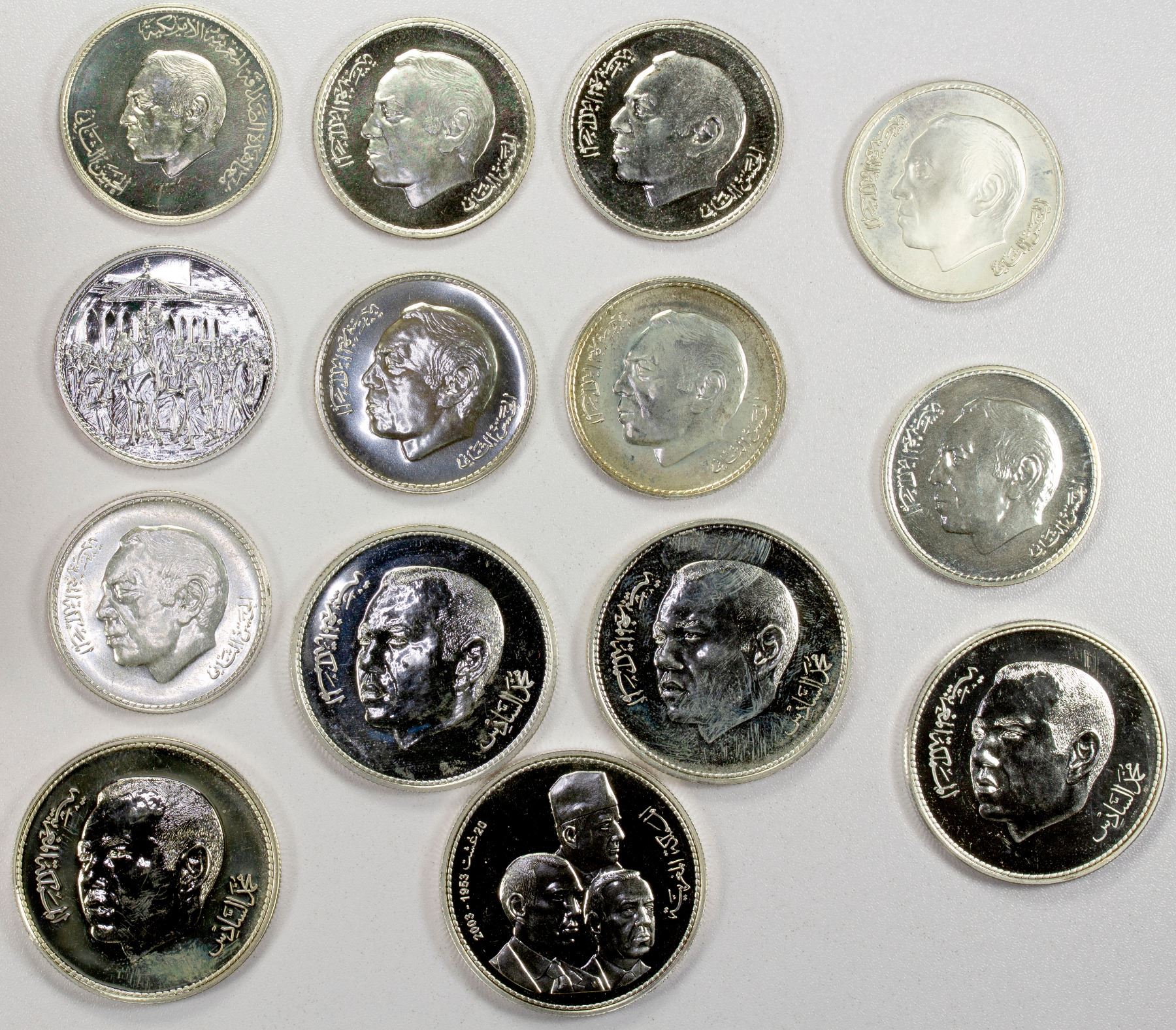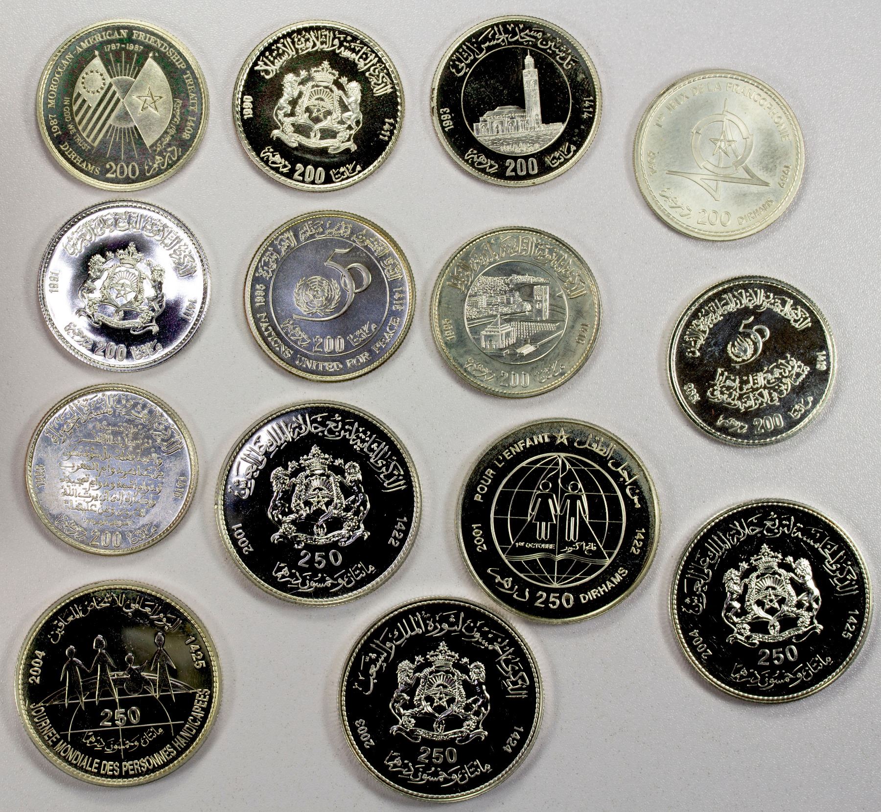 MOROCCO: LOT of 14 coins, including 200 dirhams (9 pcs, including Y-81, Y-89, Y-91, Y-96, Y-99, Y-102, Y-103, Y-104, and Y-105) and 250 dirhams (5, including Y-95, Y-107, Y-120, Y-121, and Y-122); all proof or uncirculated, perhaps a few very lightly impaired, all commemorative issues, many with very low mintages and rarely encountered, all in silver, in consignor's 2x2 holders and capsules, viewing recommended; retail value $875, lot of 14 pieces, ex Dr. Wolfgang Schuster Collection.