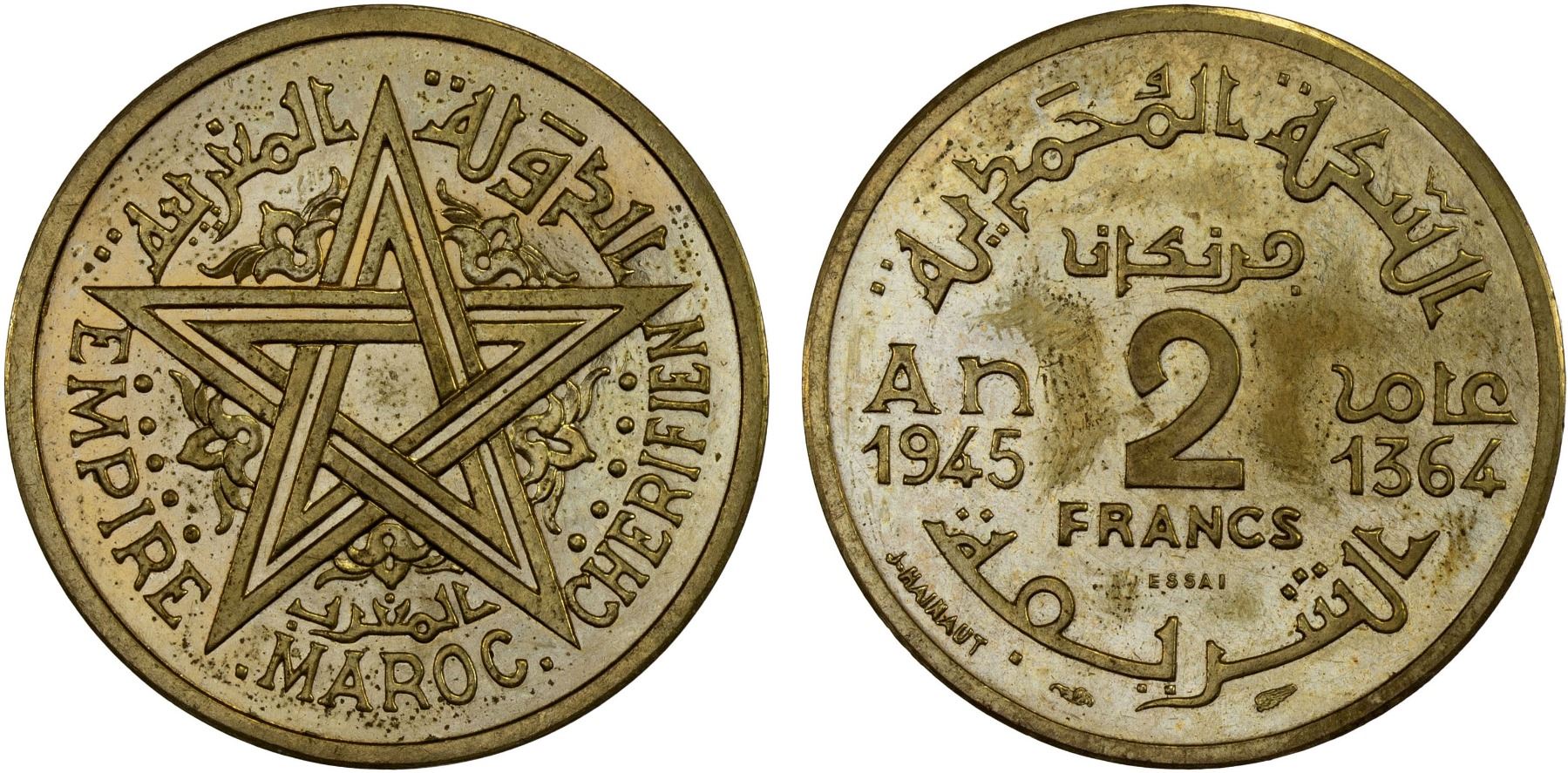 MOROCCO: Mohammed V, 1927-1962, 2 francs, 1945/AH1364, Y-PE5, essai piedfort for Y-42, scattered hairlines, lustrous, mintage of only 104 pieces, Unc.