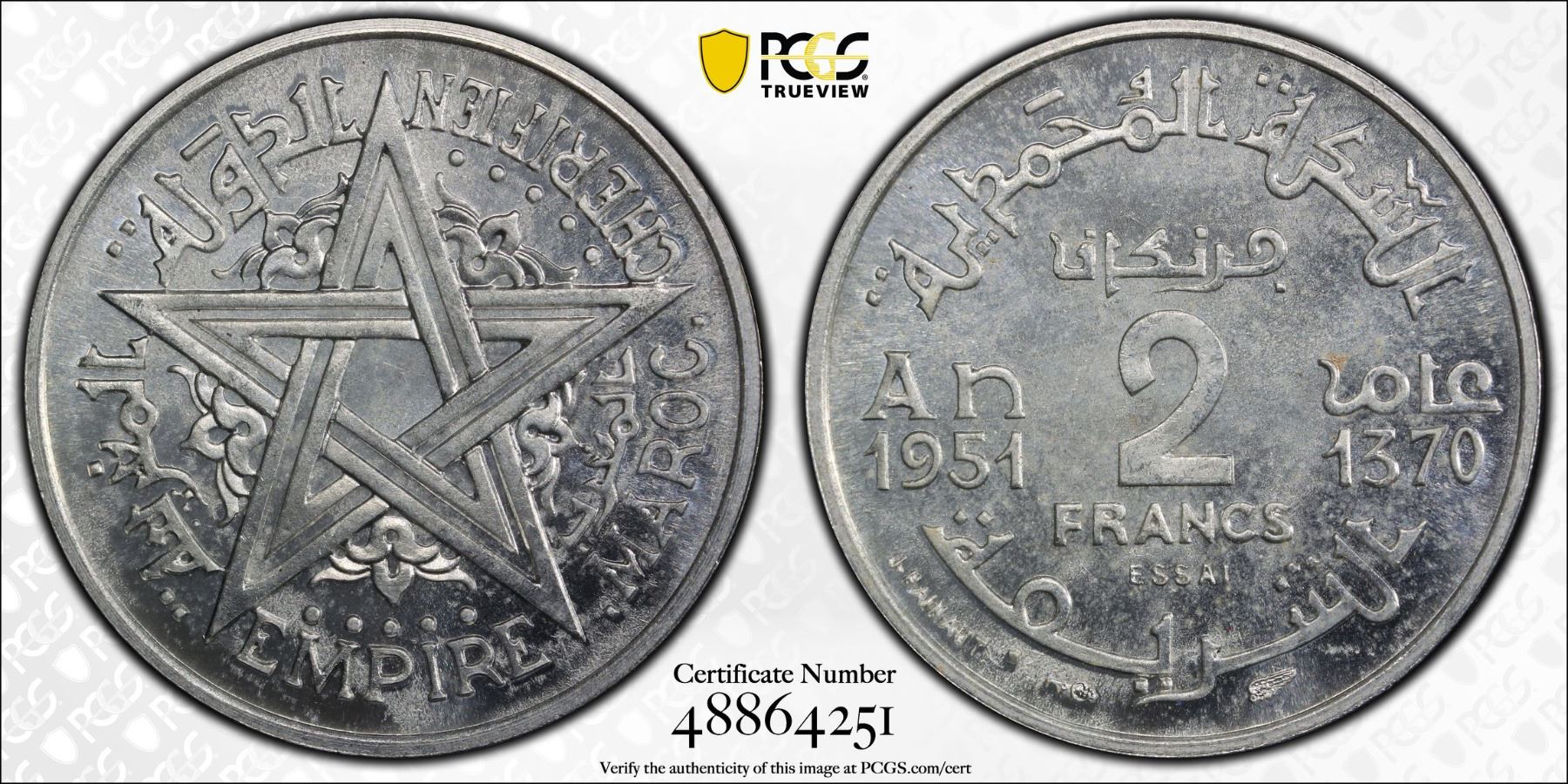 MOROCCO: Mohammed V, 1927-1962, 2 francs, 1951/AH1370, PCGS Specimen 63