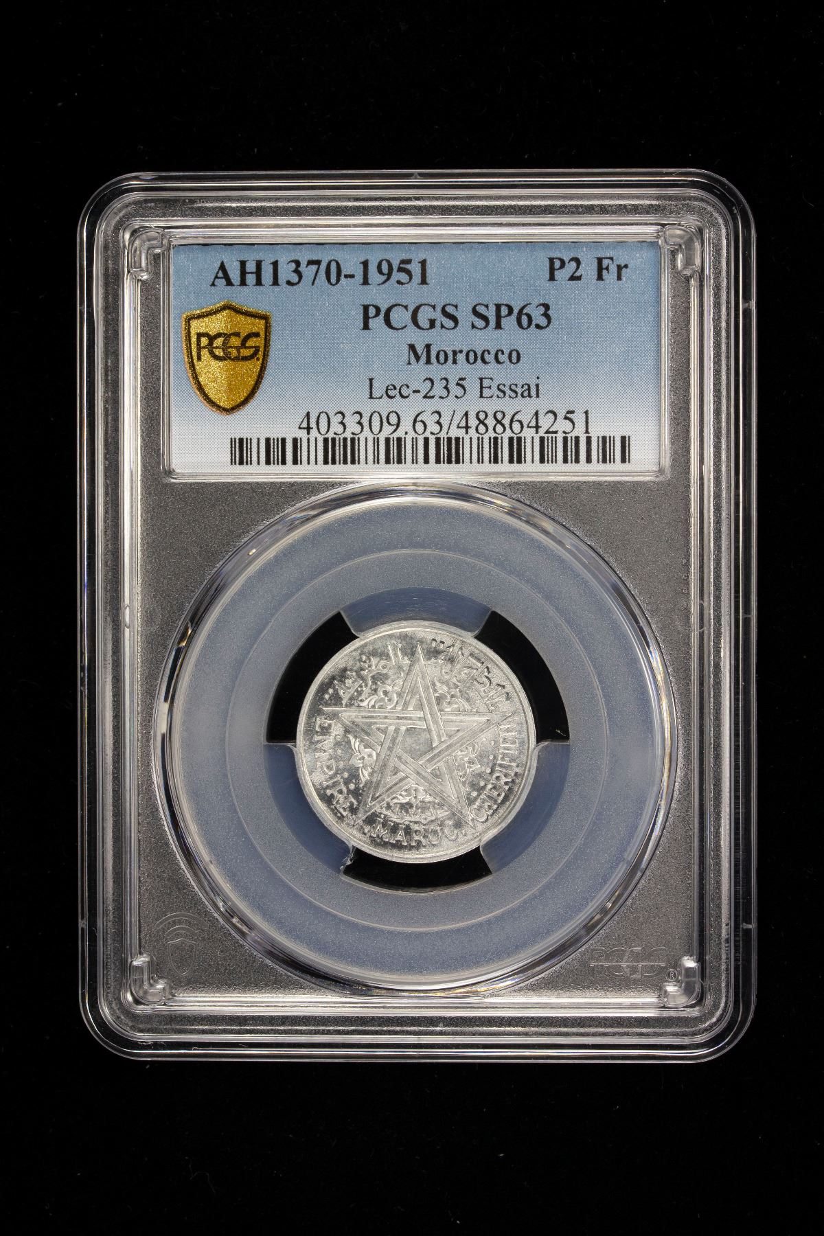 MOROCCO: Mohammed V, 1927-1962, 2 francs, 1951/AH1370, KM-E38, Lec-235, essai for Y-47, mintage of only 1,100 pieces, PCGS graded Specimen 63, S, ex Charles W. Lueders III Collection.