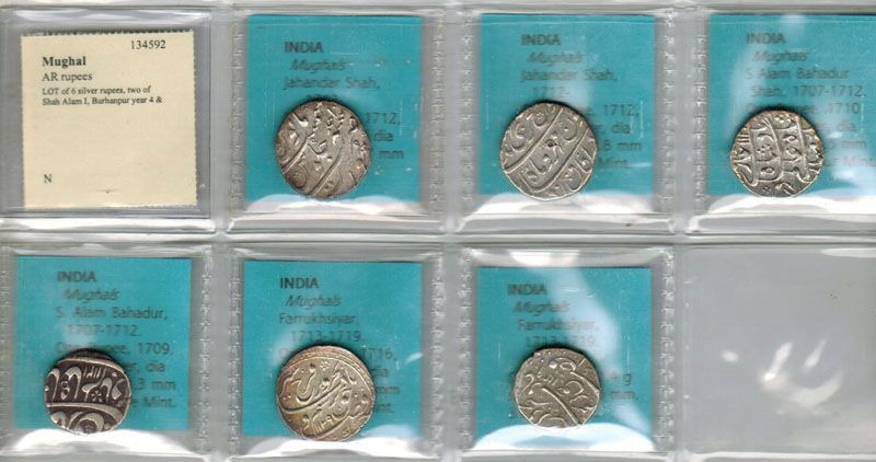 MUGHAL: AR rupees, LOT of 6 silver rupees, two of Shah Alam I, Burhanpur year 4 & Lahore 1121 year 4, two of Jahandar, both Surat year one, and two of Farrukhsiyar, Tatta 1129 year 6 and Shahjahanabad 1129 year 6, average vf, lot of 6 coins, ex. John Page Collection.