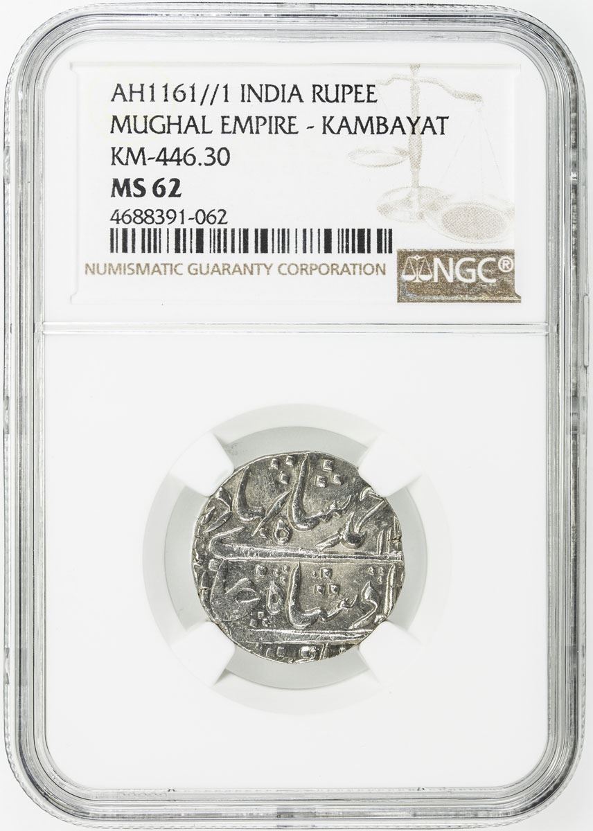 MUGHAL: Ahmad Shah Bahadur, 1748-1754, AR rupee, Khambayat, AH1161 year one, KM-446.30, NGC graded MS62.