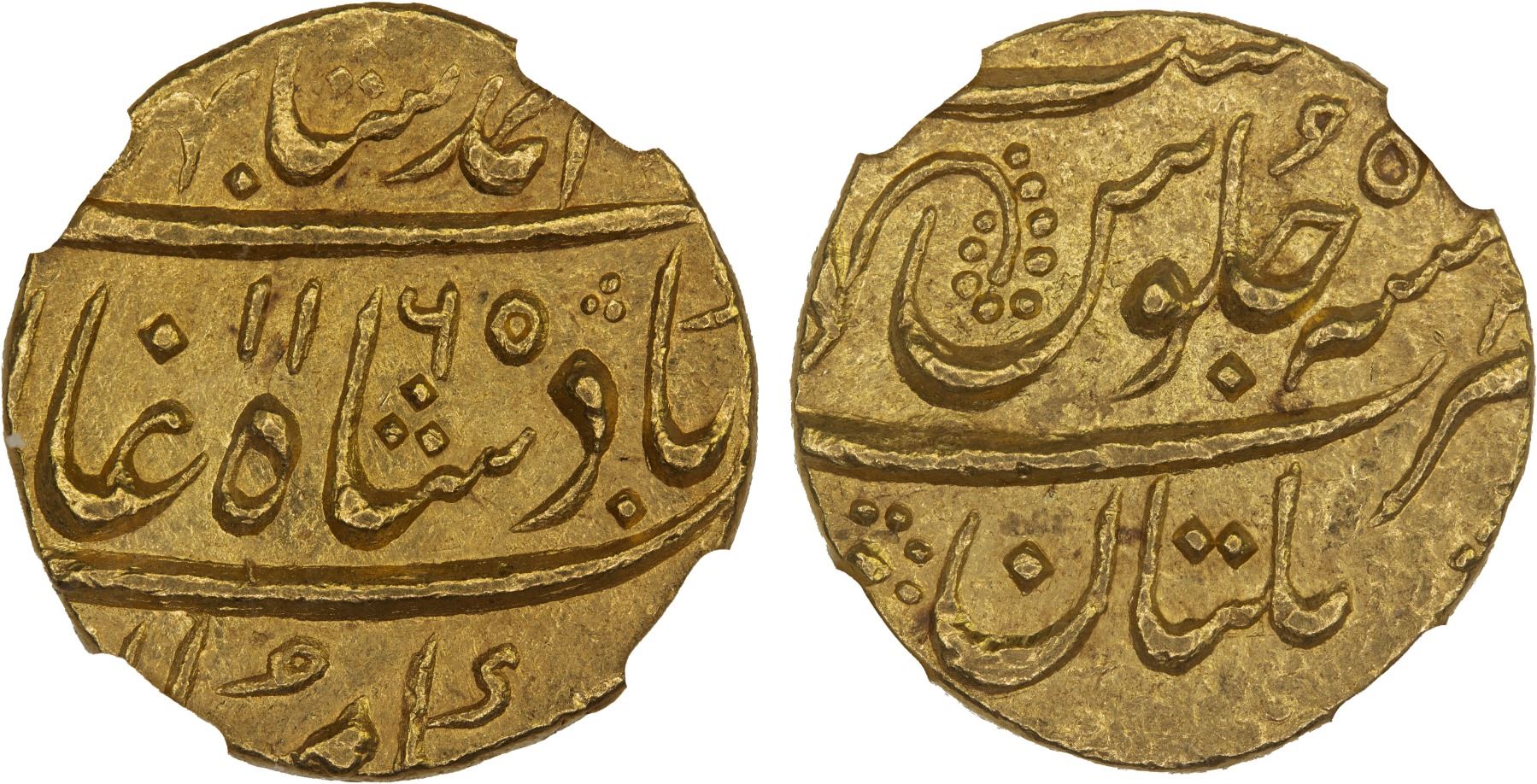 MUGHAL: Ahmad Shah Bahadur, 1748-1754, AV mohur, Multan, AH1165 year 5, NGC MS65