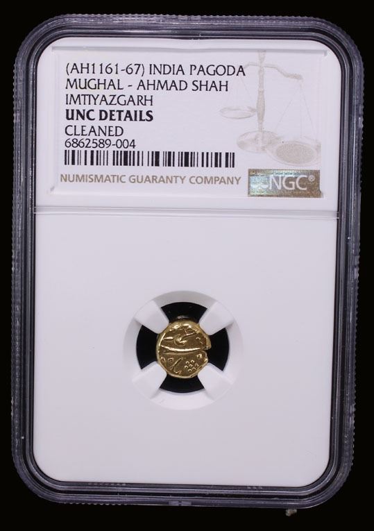 MUGHAL: Ahmad Shah Bahadur, 1748-1754, AV pagoda, Imtiyazgarh, ND, KM-C450.1, excellent strike, cleaned (barely noticeable), NGC graded Unc details, R.