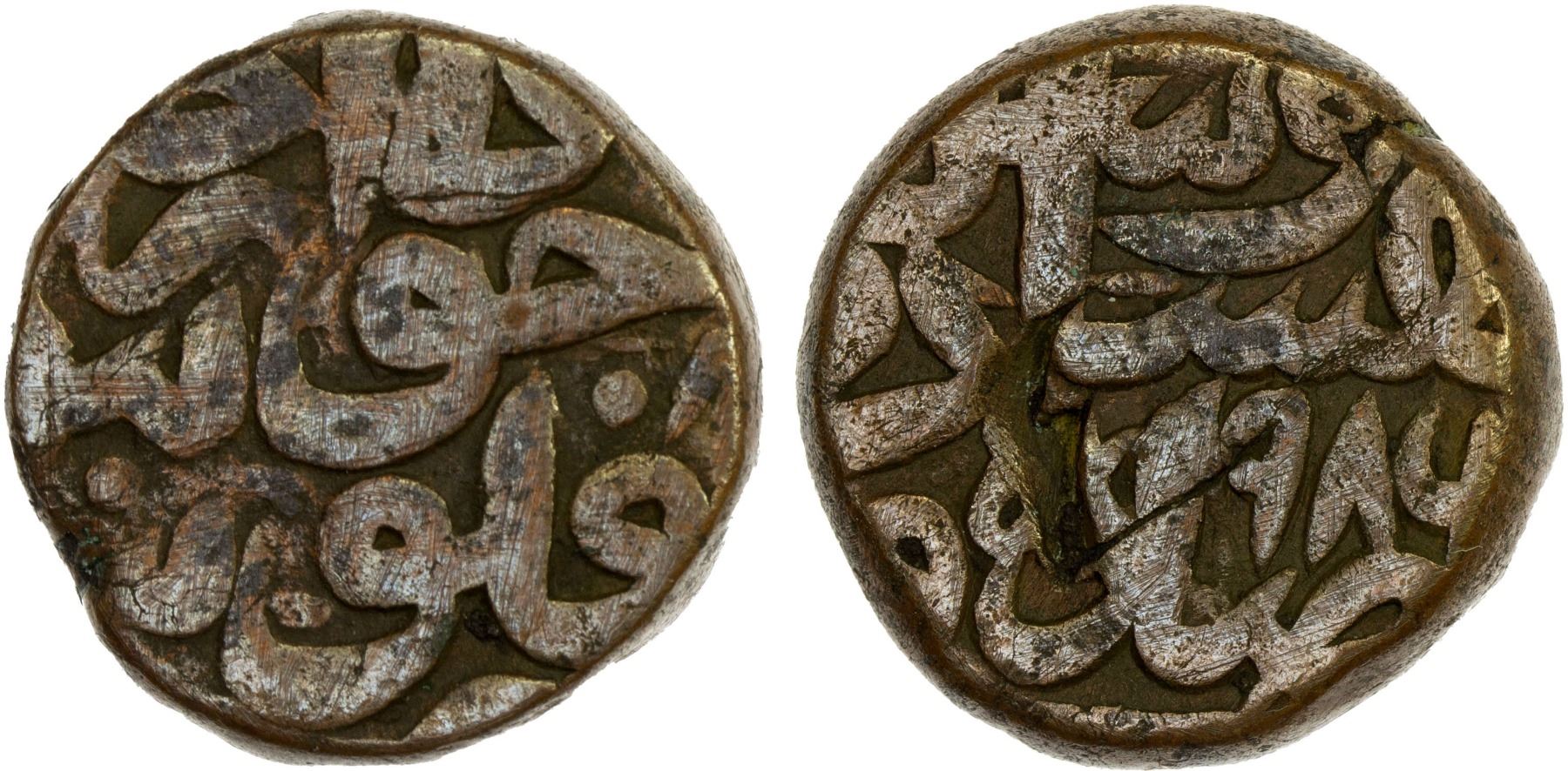 MUGHAL: Akbar I, 1556-1605, AE dam (20.41g), Jaunpur, AH986, KM-28.27, nice strike; small flan defect at the reverse center, VF.