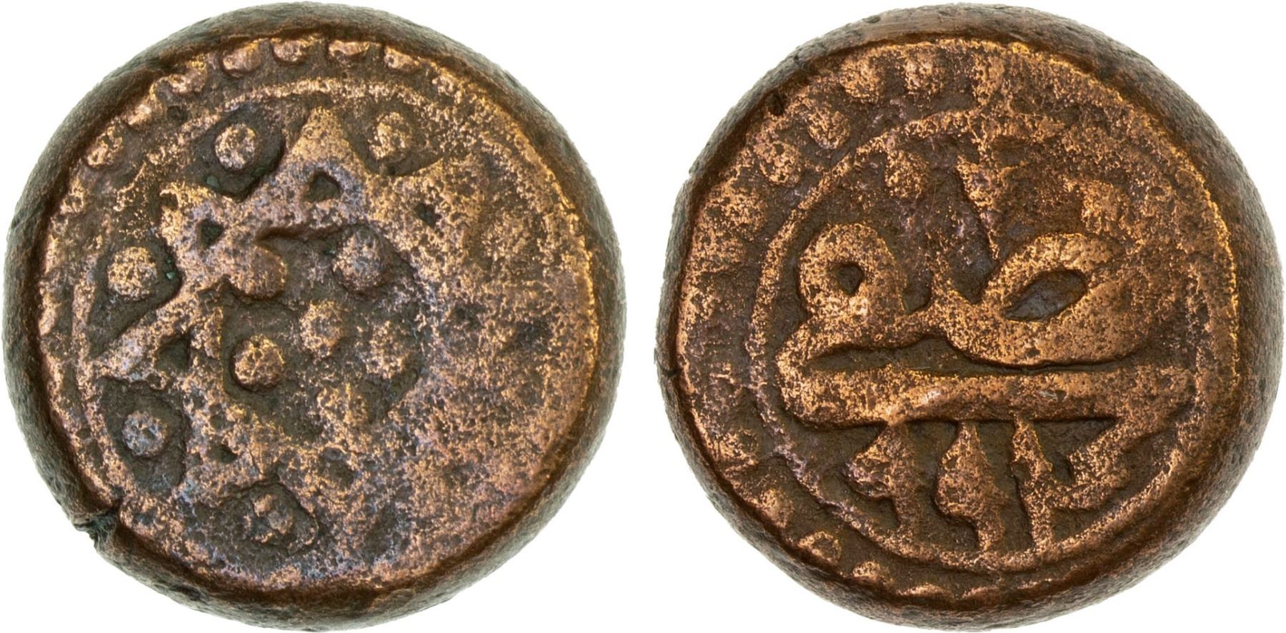 MUGHAL: Akbar I, 1556-1605, AE nisfi (1/2 dam) (10.25g), NM, AH994, KM-25.1, 8-point star // denomination ("nisfi") and date; there are several examples on CoinArchives, but all are the more available undated version except the example sold in our Auction 53, lot 2425, also dated AH994, F-VF, RRR.