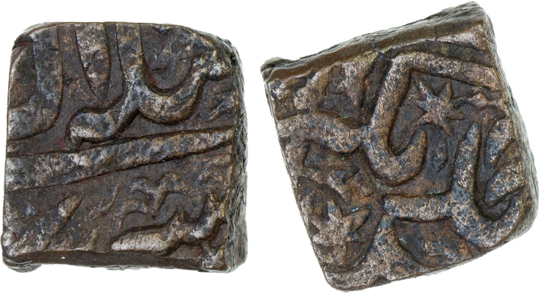 MUGHAL: Akbar I, 1556-1605, AE square 1/8 tanka (6.61g), Ahmadnagar, ND, KM-, Zeno-159745, local issue, probably struck only at Ahmadnagar, XF, RR.