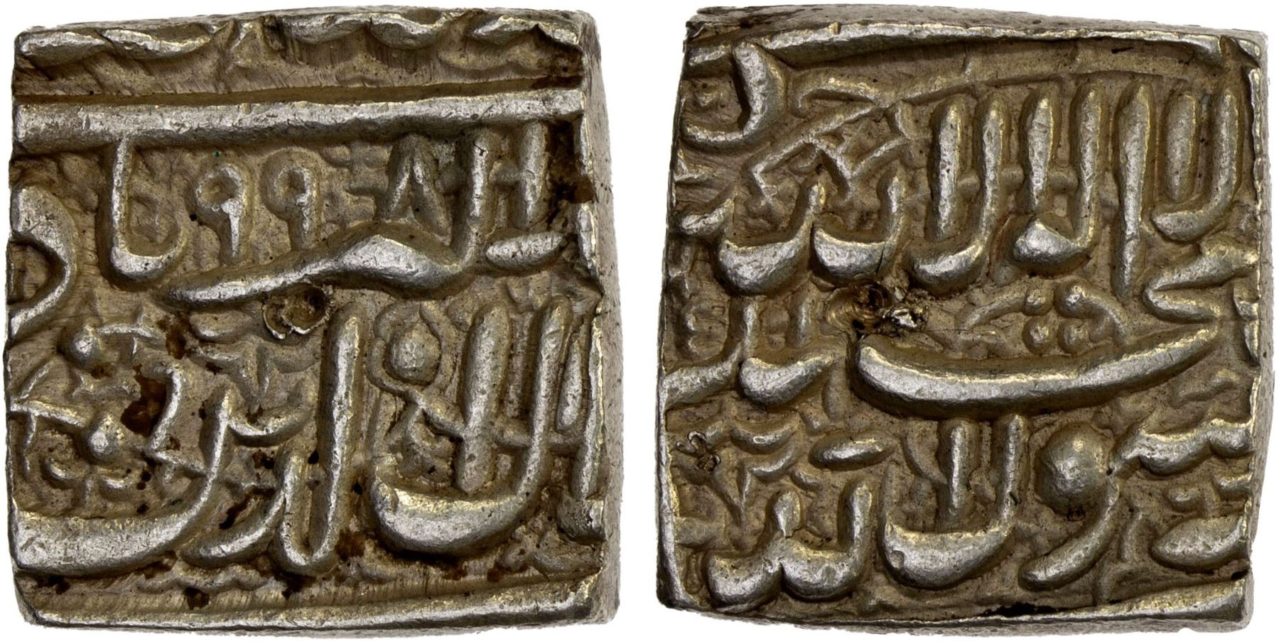 MUGHAL: Akbar I, 1556-1605, AR rupee (11.42g), AH998, KM-82, square planchet, uncertain mint, XF.