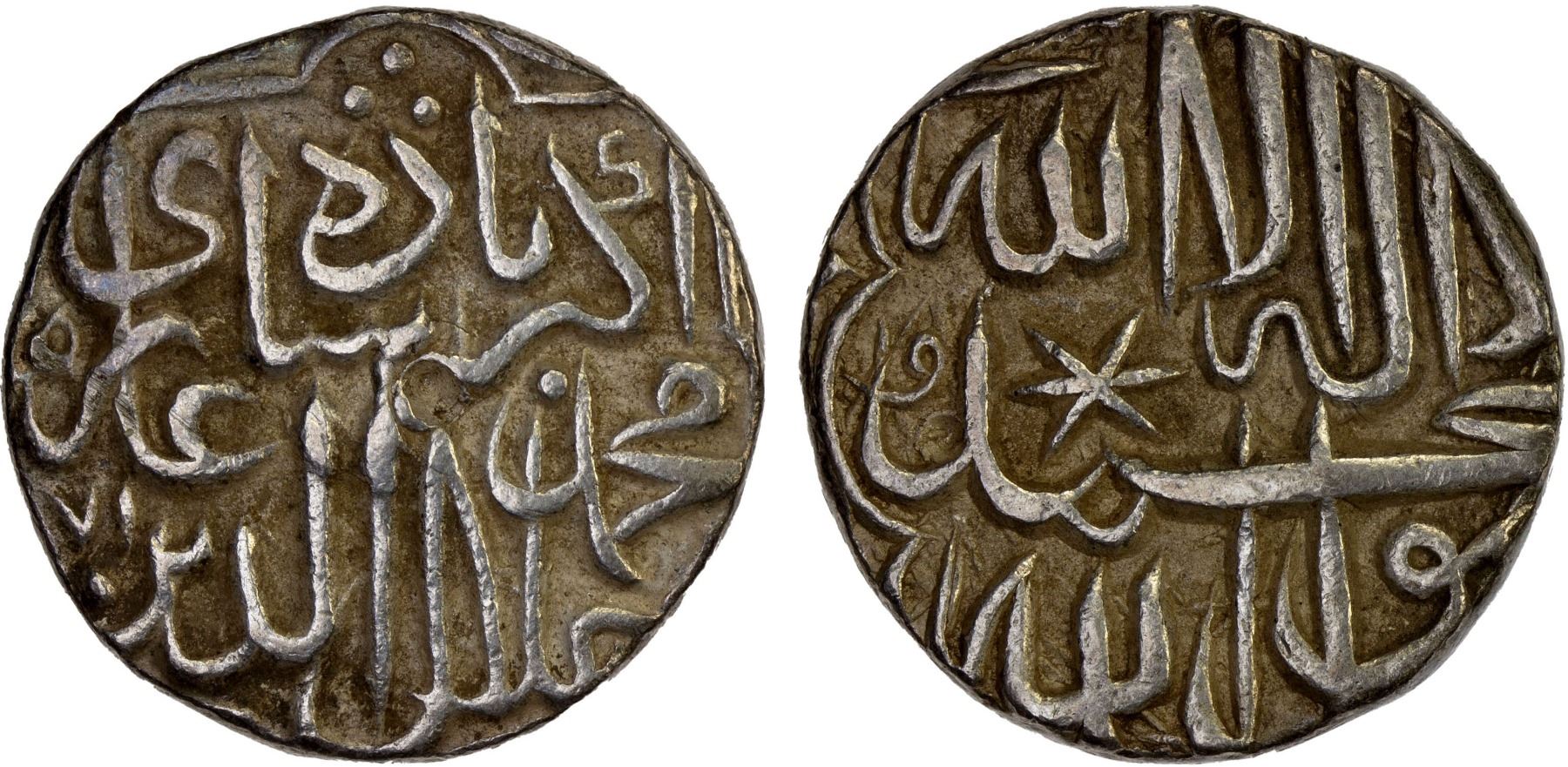 MUGHAL: Akbar I, 1556-1605, AR rupee (11.46g), uncertain mint, ND, KM-80, design is lobated square // scalloped border, with the unique distinction of a large star in the middle of the reverse; we have not found any reference to this variety or any mint where it might have been struck, XF, RR.