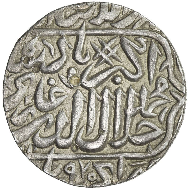 MUGHAL: Akbar I, 1556-1605, AR rupee (11.49g), Akbarpur Tanda, AH970, KM-80.3, superb strike, 5 tiny testmarks, bold EF, R, ex Paul Stevens Collection.
