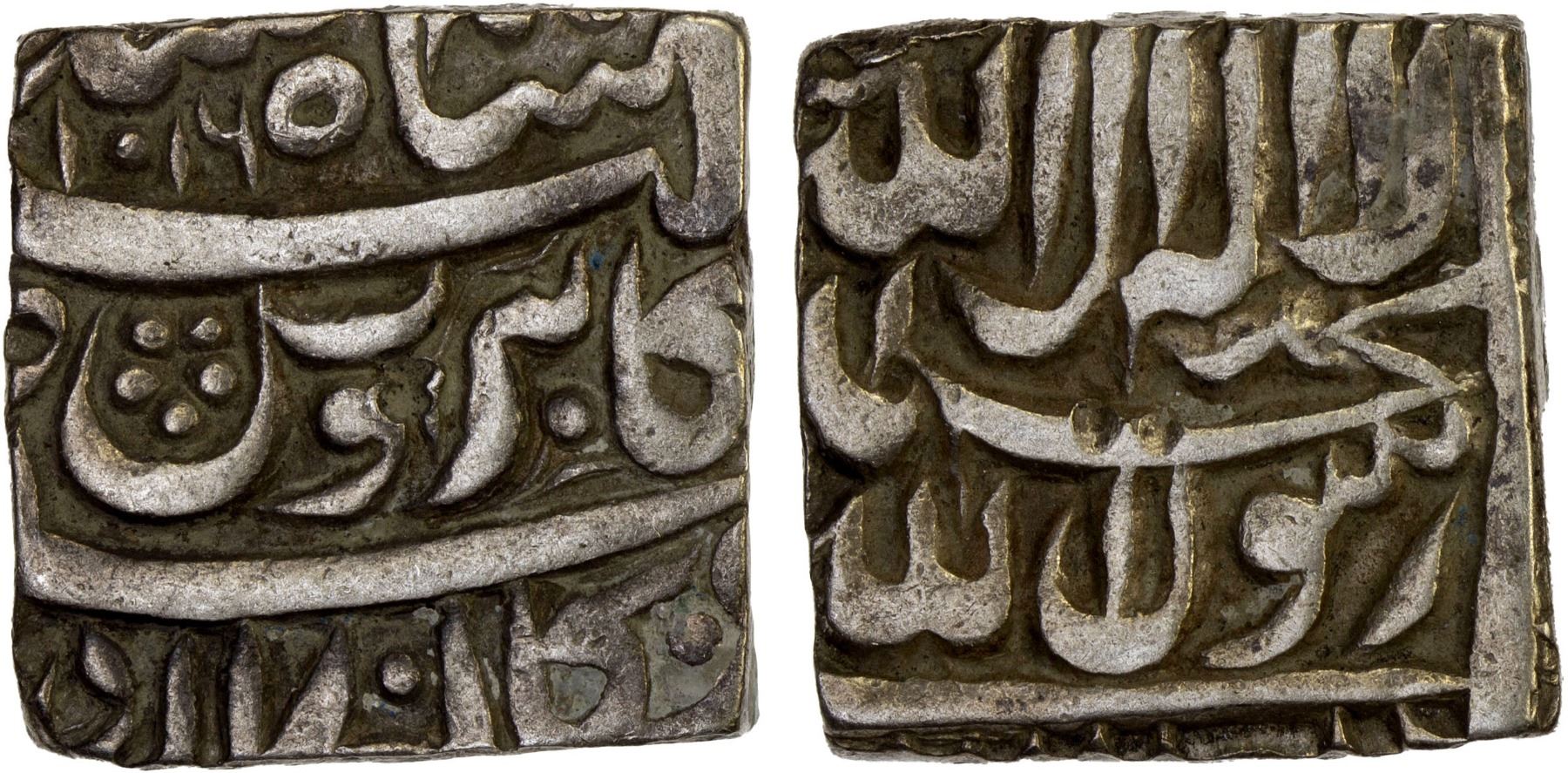 MUGHAL: Akbar I, 1556-1605, AR square rupee (11.25g), Bangala, AH1016, KM-86.1, posthumous issue with the "Kabe Roshan" couplet; very rare date (none on CoinArchives or acsearch), bold VF, R.