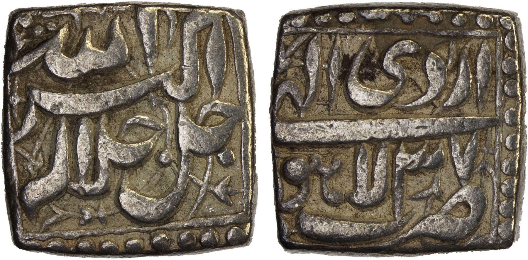 MUGHAL: Akbar I, 1556-1605, AR square rupee (11.25g), Lahore, IE37, KM-88.3, month of Ardu (for Ardubihisht), excellent strike, much rarer than the round Lahore rupees of the Ilahi period, without any testmarks, bold VF, R.
